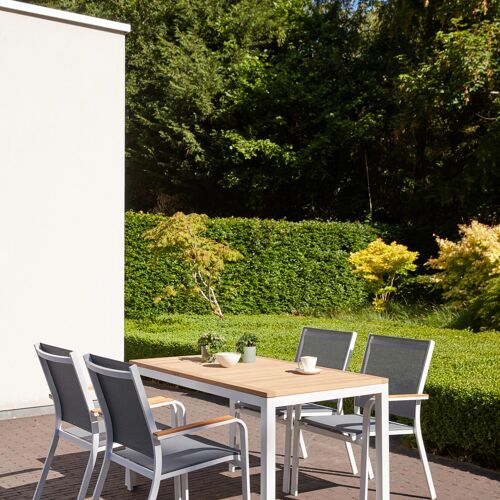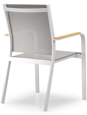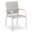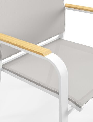 De Amalfi stoel is een stijlvolle stoel met afgeronde armleuningen en heeft een natuurlijke look uit door de armleuningen in teak. De Amalfi stoel heeft een frame uit roestvrij aluminium. De zitting en rugleuning zijn gemaakt uit stevige textilene, een stijlvol en onderhoudsvriendelijk materiaal. Verkrijgbaar in verschillende kleuren. De stoel is stapelbaar en dus makkelijk op te bergen.