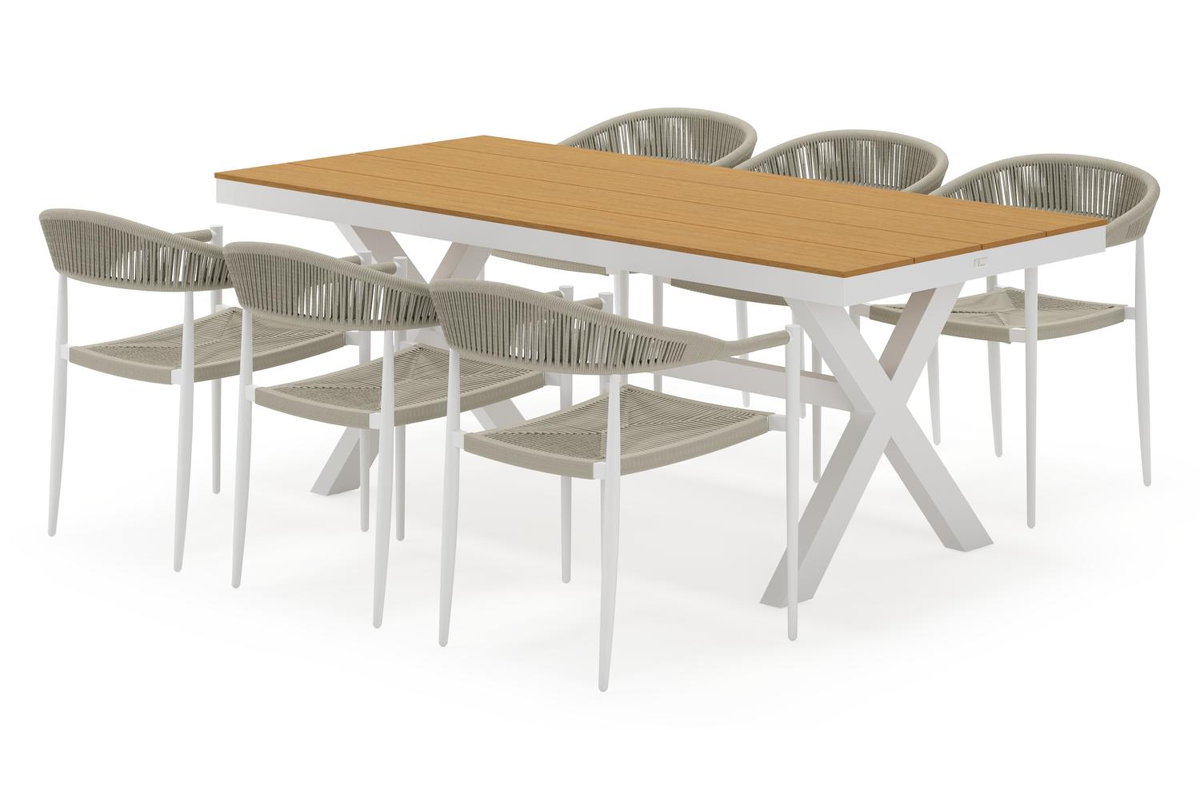 De Bahia tuintafel herken je aan de stevige look en kruispoot. Het frame waarop het tafelblad ligt, is robuust. In het midden van de tafel loopt een balk als extra ondersteuning van het frame.