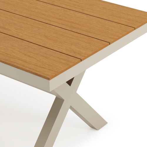 De Bahia tuintafel herken je aan de stevige look en kruispoot. Het frame waarop het tafelblad ligt, is robuust. In het midden van de tafel loopt een balk als extra ondersteuning van het frame.