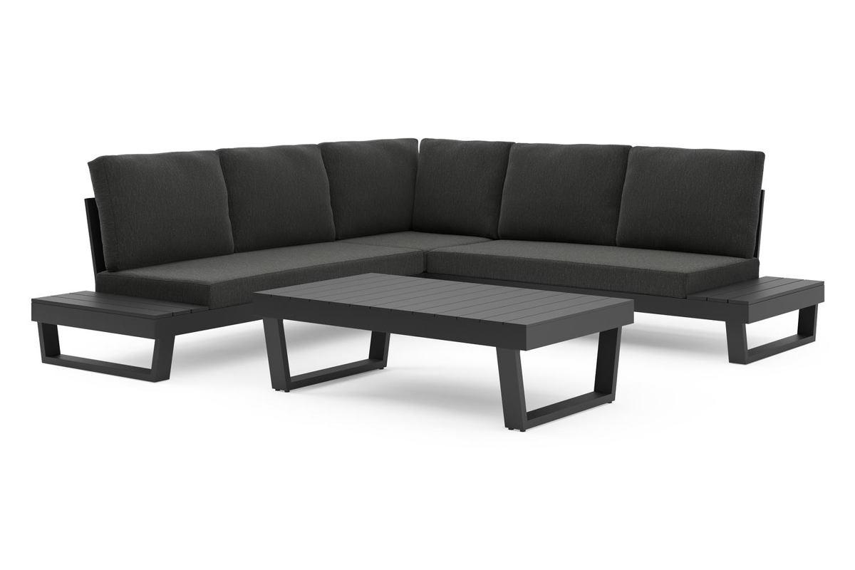 Modica loungehoek in zwart aluminium met rustic weather+ softtouch kussens en loungetafel | Exterioo