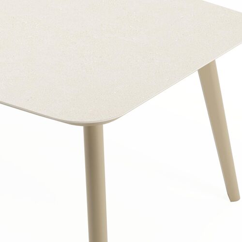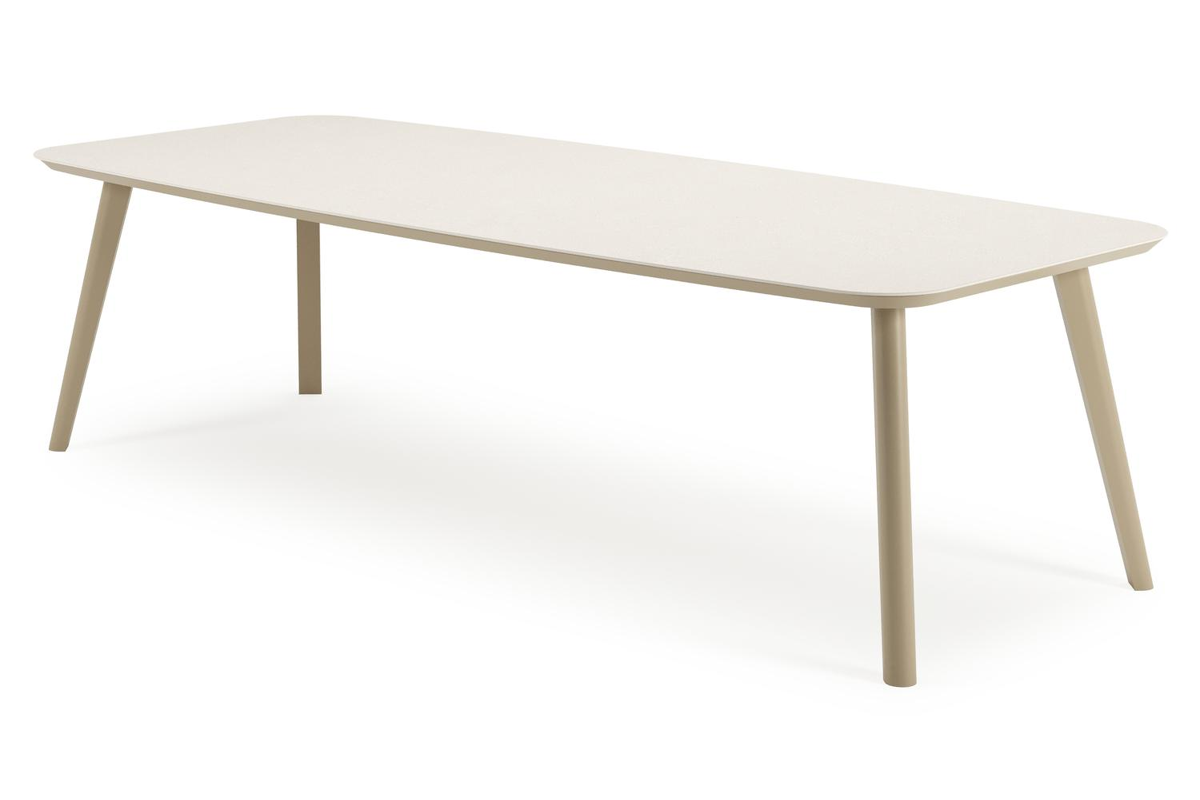 De Mosa tuintafel herken je makkelijk aan het afgerond rechthoekig tafelblad en de naar buiten afgeschuinde poten. De tafel heeft een moderne look met een elegante touch.