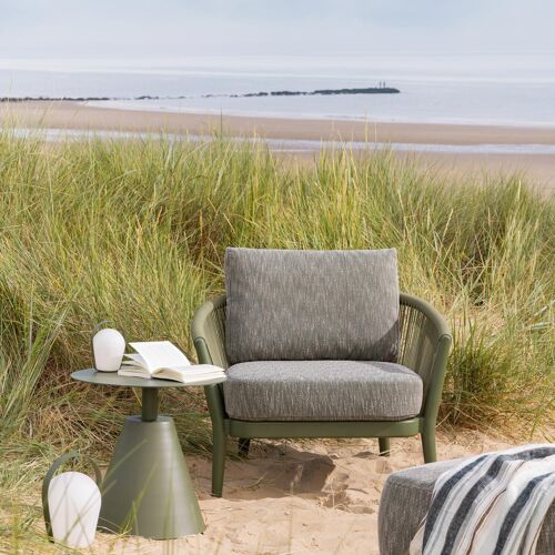 Orso loungestoel in groen aluminium en groen verticaal geweven ronde rope met Bora Jungle all weather cosytica kussen | Exterioo