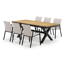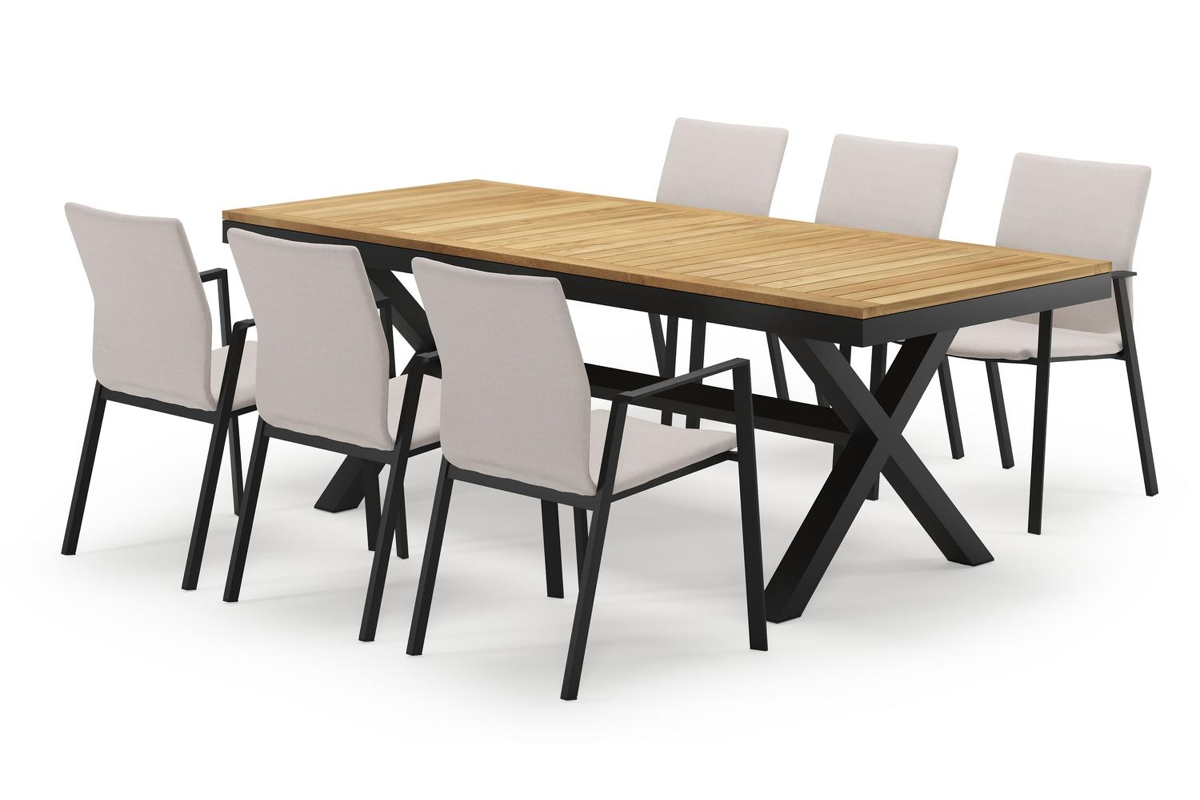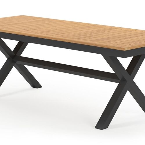 De Reza tuinset heeft een uitzonderlijke kruispoot en een stevig, dik frame waarin het tafelblad geplaatst is. In het midden van de tafel loopt een balk als extra ondersteuning van het frame.