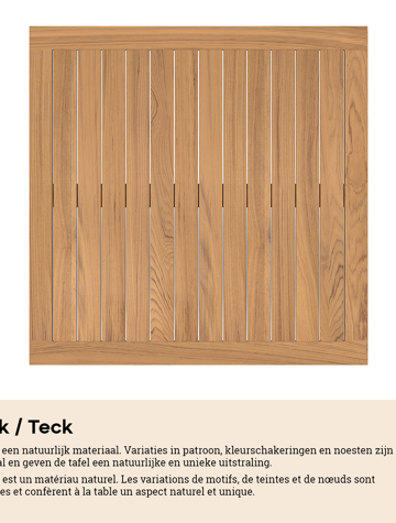 Een tafelblad uit teak staat gelijk aan bijzondere kwaliteit en natuurlijk design. Teak is een kwalitatieve houtsoort gekenmerkt door zijn hardheid. Aangezien hout leeft, kan de structuur of kleur licht anders zijn dan op het beeld weergegeven.