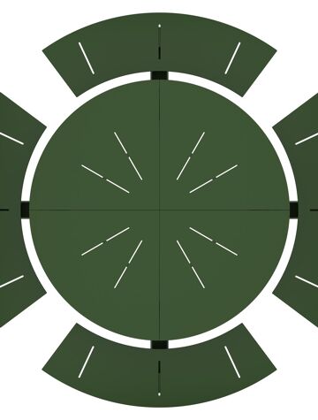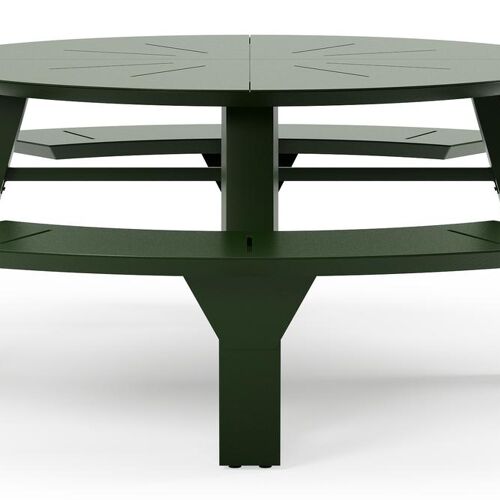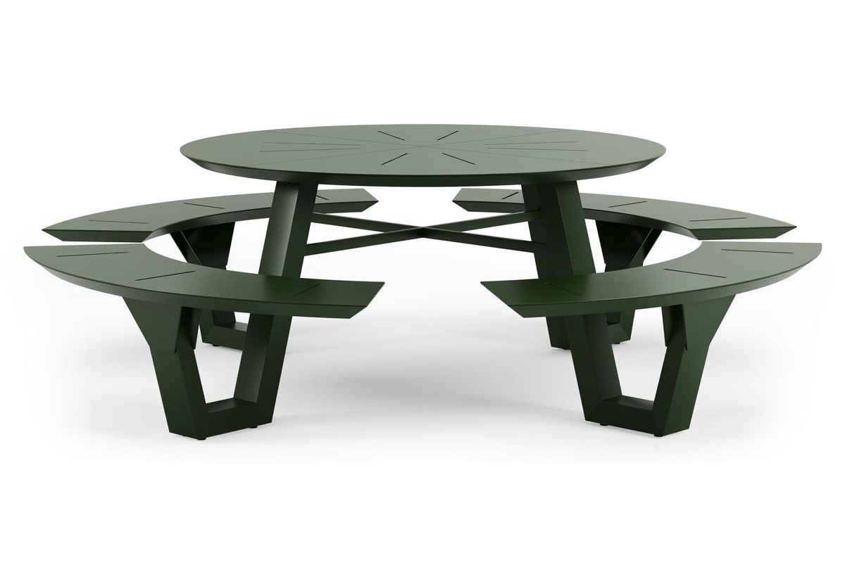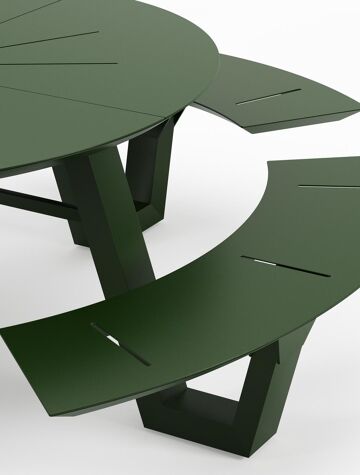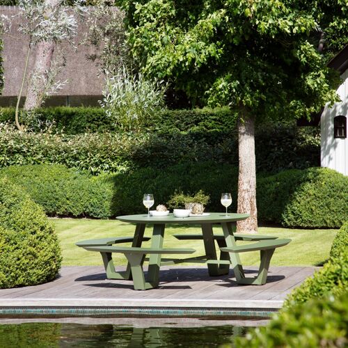 De Rondino picknicktafel omarmt een minimalistisch design met een robuuste look. De langwerpige banken sluiten naadloos aan op het frame van de tafel, waardoor een gestroomlijnde en samenhangende look ontstaat. De ronde vorm zorgt ervoor dat je gezellig met meerdere mensen bij elkaar kan zitten.