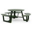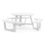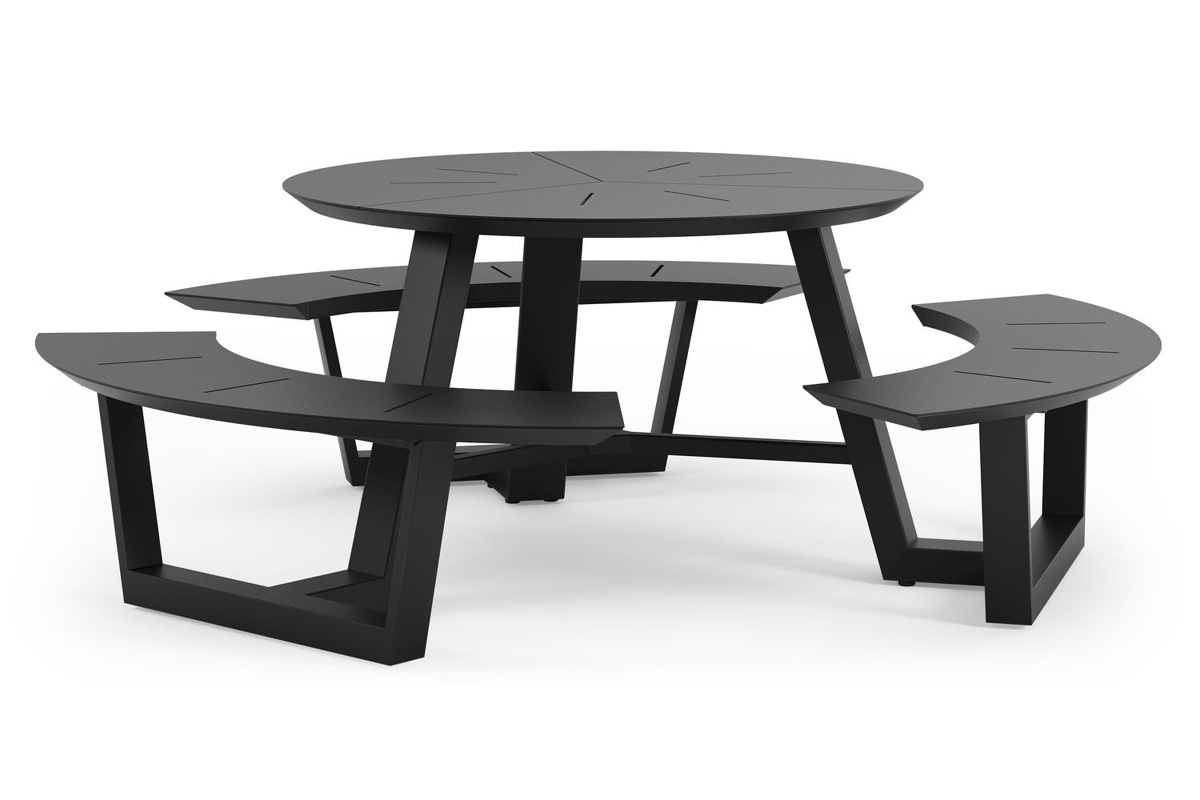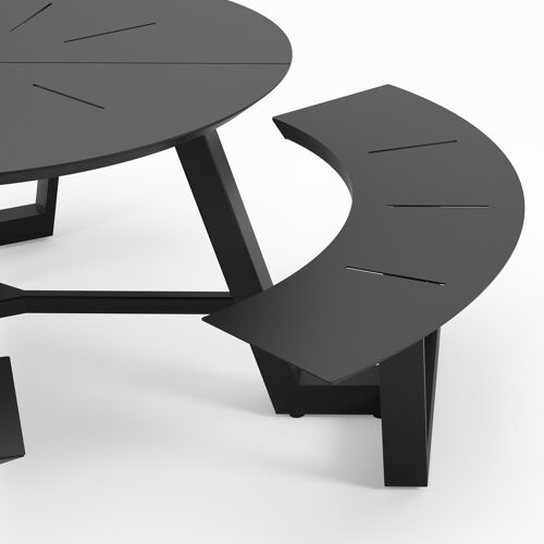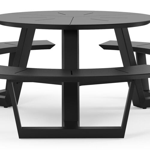 De Rondino picknicktafel omarmt een minimalistisch design met een robuuste look. De langwerpige banken sluiten naadloos aan op het frame van de tafel, waardoor een gestroomlijnde en samenhangende look ontstaat. De ronde vorm zorgt ervoor dat je gezellig met meerdere mensen bij elkaar kan zitten.