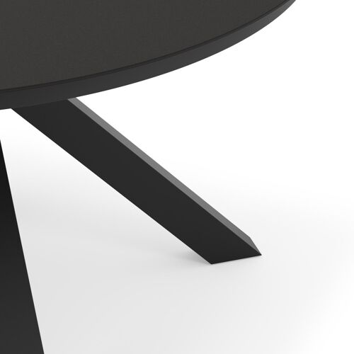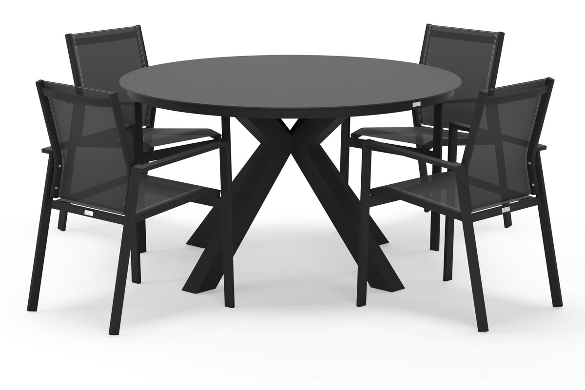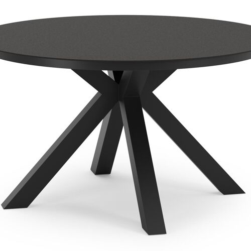 De Tora tuintafel is een collectie met ronde tafels. De kenmerkende kruispoot splitst zich onder het frame uit in vier gespreide poten, wat zorgt voor extra stabiliteit.