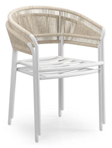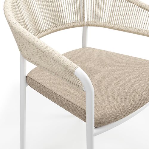 De Zamora tuinstoel combineert een stijlvolle uitstraling met een aangenaam zitcomfort. Het frame is gemaakt uit roestvrij aluminium. De rugleuning en armleuning zijn volledig afgewerkt met rope voor een hedendaagse elegante touch. De stoel is stapelbaar en dus makkelijk op te bergen. De stoelkussens zijn inbegrepen en gemaakt uit Weather+ Softtouch. De duurzame kussens voelen zacht aan en zijn vuilafstotend. Weather+ Softtouch kussens zijn beperkt waterafstotend. In de winter of bij langdurige regen bewaar je de kussens best binnen.