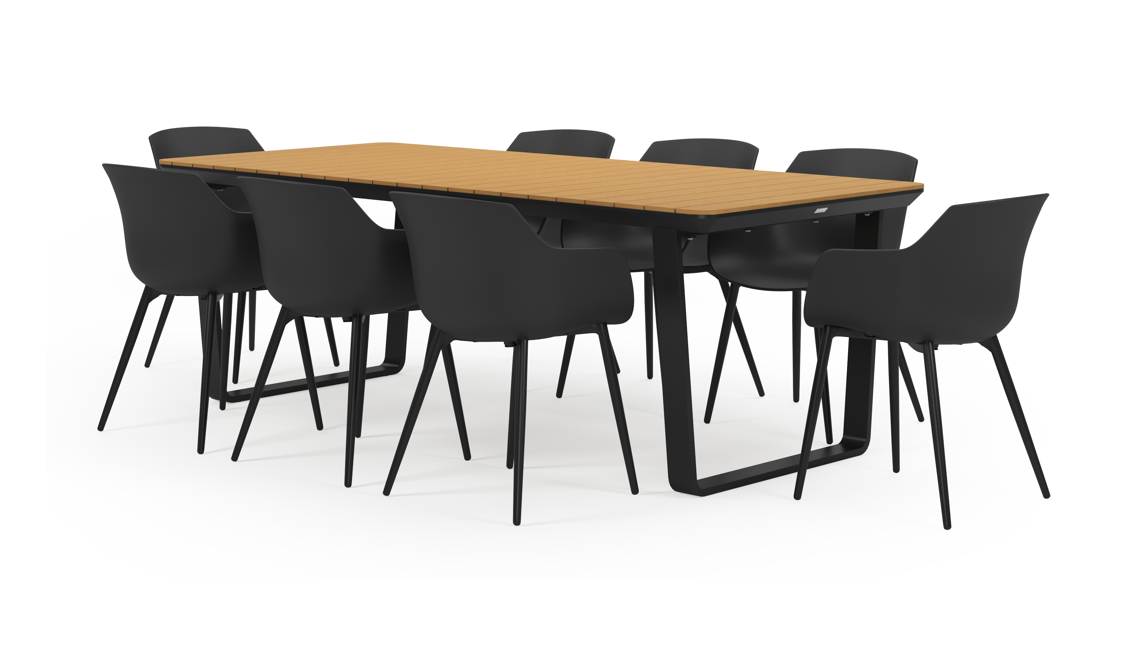 Alora tuinset heeft een eigen specifieke stijl met afgeronde lijnen. Het frame loopt schuin af en het tafelblad loopt de rand. De trapeziumvormige tafelpoten zijn geïntegreerd onder het frame en lopen volledig door.