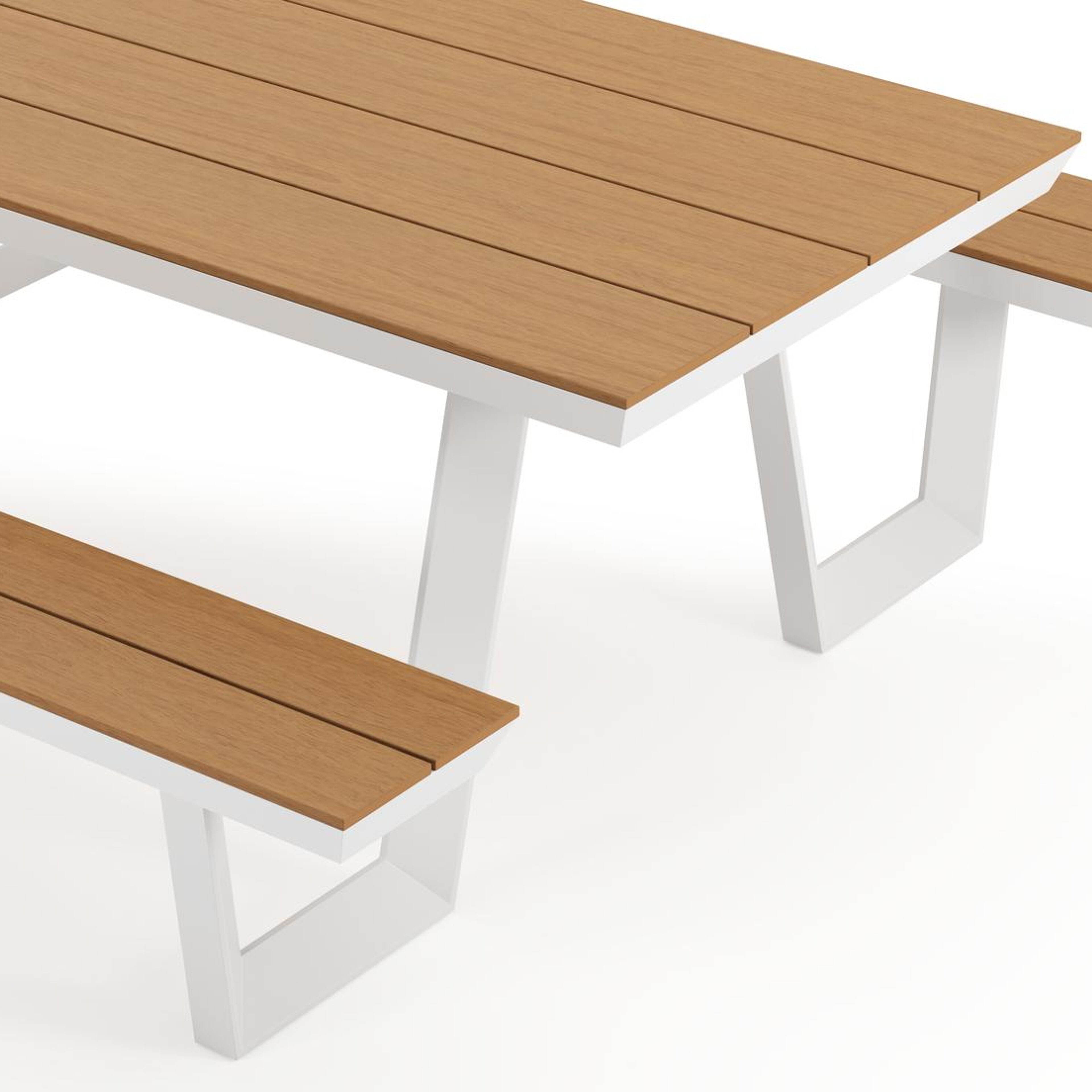 De Altura picknicktafel heeft een moderne en gezellige uitstraling. Het frame is gemaakt uit roestvrij aluminium, een stevig en licht materiaal. Je kan de picknicktafel makkelijk herkennen door zijn typisch afgeschuinde randen. Daarnaast beschikt de picknicktafel ook over een lage instap, waardoor het makkelijk is om te zitten. Het tafelblad is afgewerkt in polywood. Let wel: polywood is een synthetisch materiaal. Intensieve warmte kan het materiaal wel beschadigen - zoals zonlicht dat door glazen valt. Gebruik daarom altijd een onderzetter of dienblad. Met de Altura picknicktafel geniet je van geweldige buitenmomenten aan een scherpe prijs.