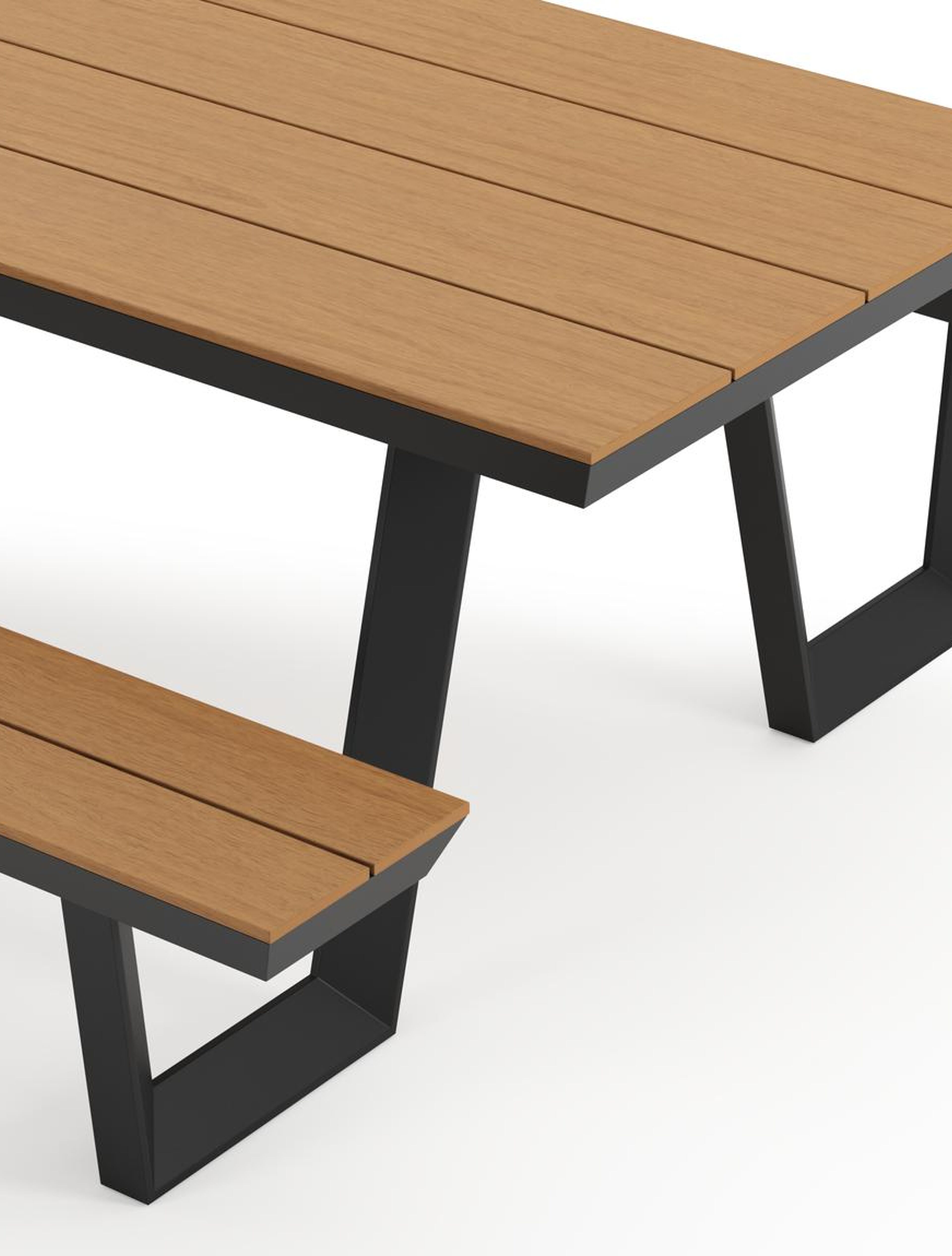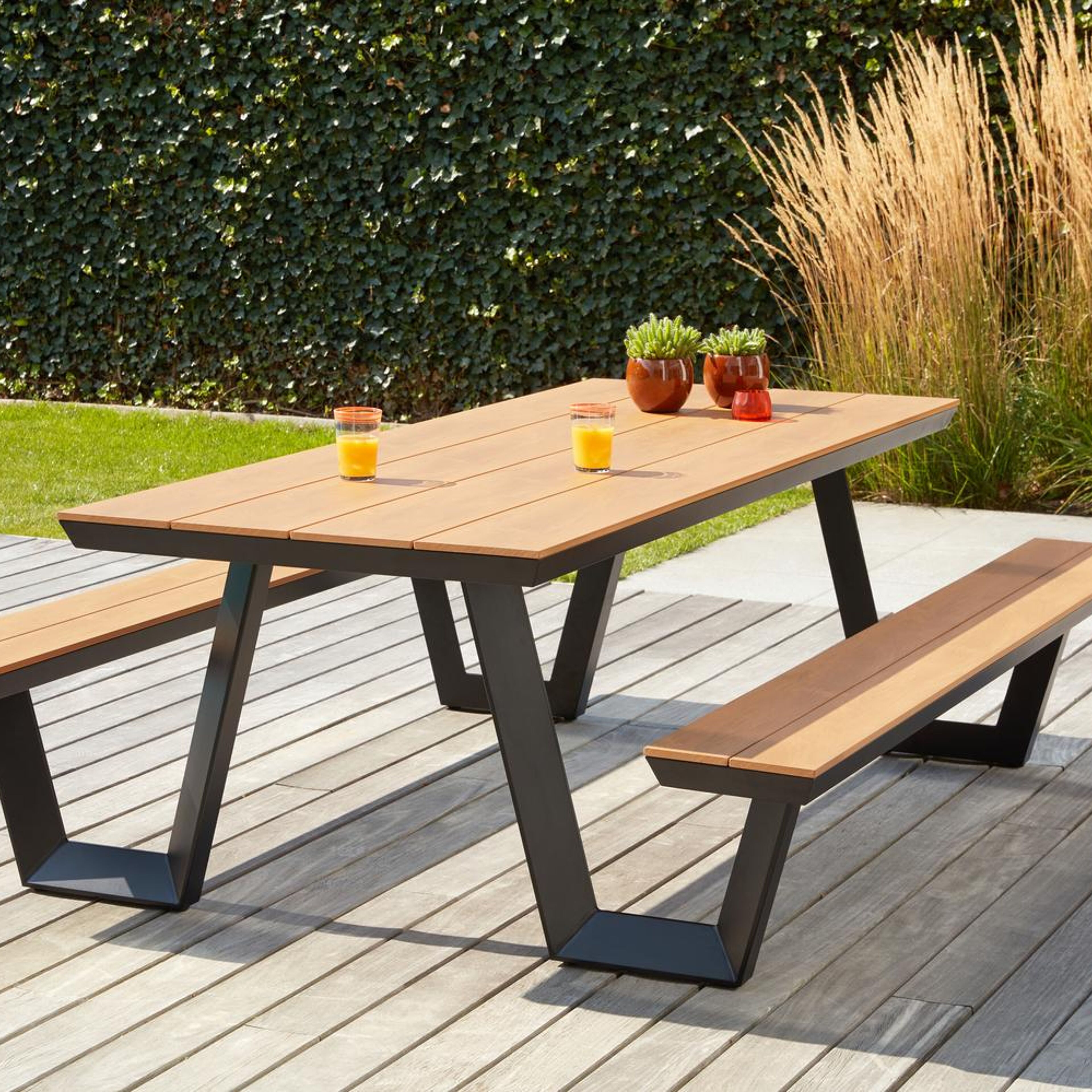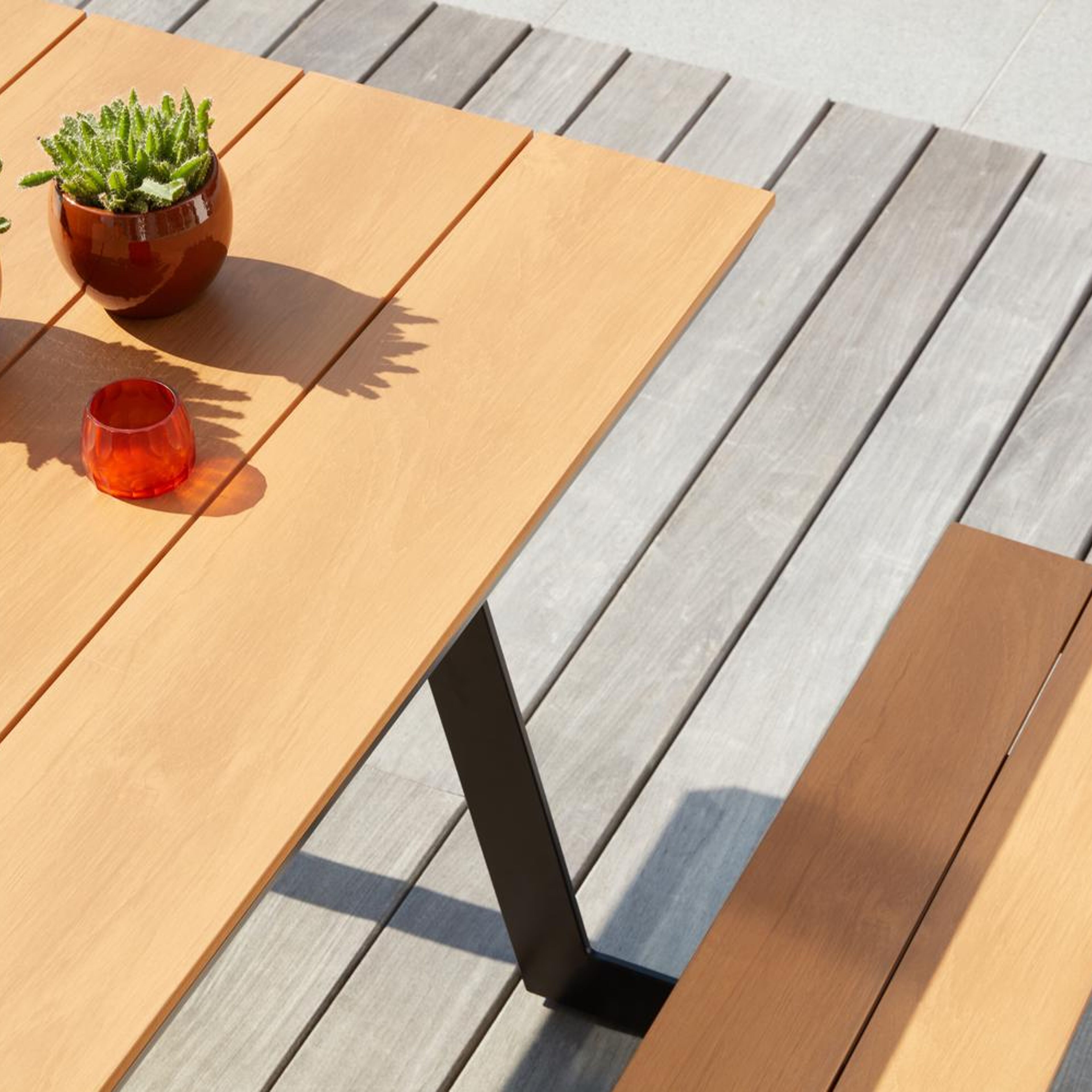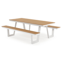 De Altura picknicktafel heeft een moderne en gezellige uitstraling. Het frame is gemaakt uit roestvrij aluminium, een stevig en licht materiaal. Je kan de picknicktafel makkelijk herkennen door zijn typisch afgeschuinde randen. Daarnaast beschikt de picknicktafel ook over een lage instap, waardoor het makkelijk is om te zitten. Het tafelblad is afgewerkt in polywood. Let wel: polywood is een synthetisch materiaal. Intensieve warmte kan het materiaal wel beschadigen - zoals zonlicht dat door glazen valt. Gebruik daarom altijd een onderzetter of dienblad. Met de Altura picknicktafel geniet je van geweldige buitenmomenten aan een scherpe prijs.