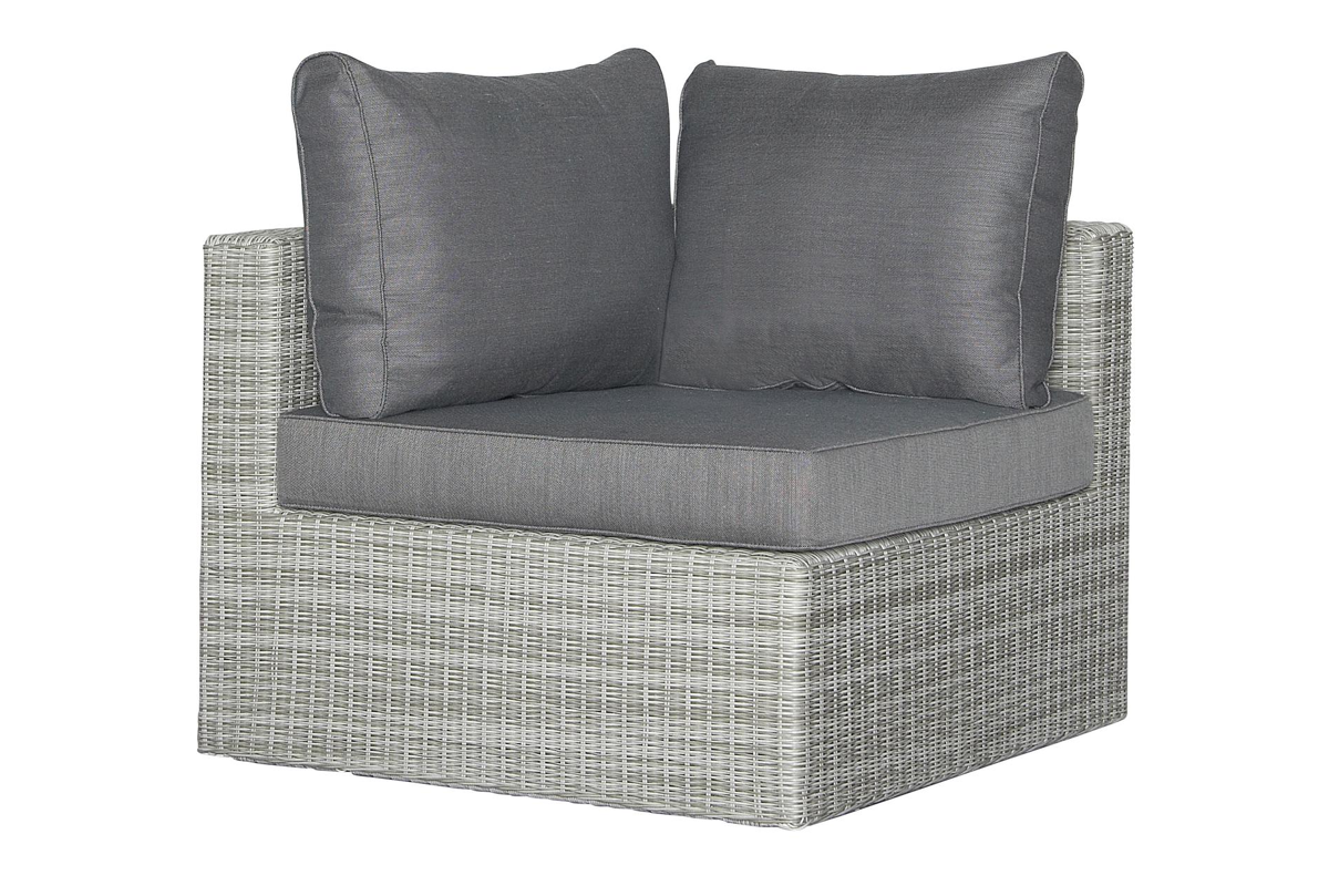 Hoekstuk van weersbestendige 3mm ronde wicker op een roestvrij en stevig aluminium frame. Eindeloos combineerbaar met andere stukken uit de Amari serie. Kleur: Wit-grijs. UV-bestendig. Incl. zit- en rugkussen, waterafstotend behandeld. Incl. verbindingsstukken. B 84 x D 84 x H 64 cm.