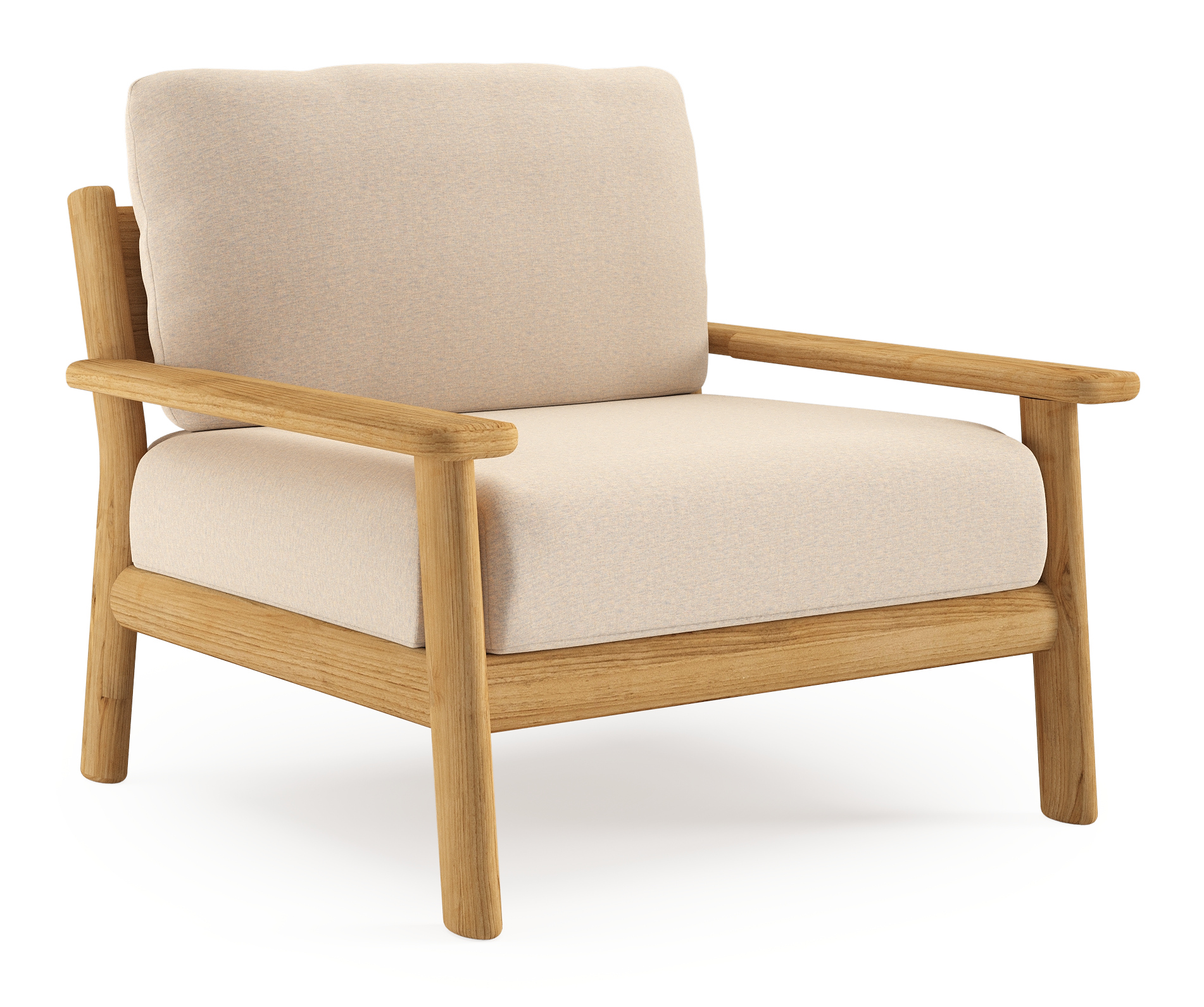 Amaro loungestoel in teak met heritage papyrus all weather sunbrella® luxe kussen | Exterioo tuinmeubelen