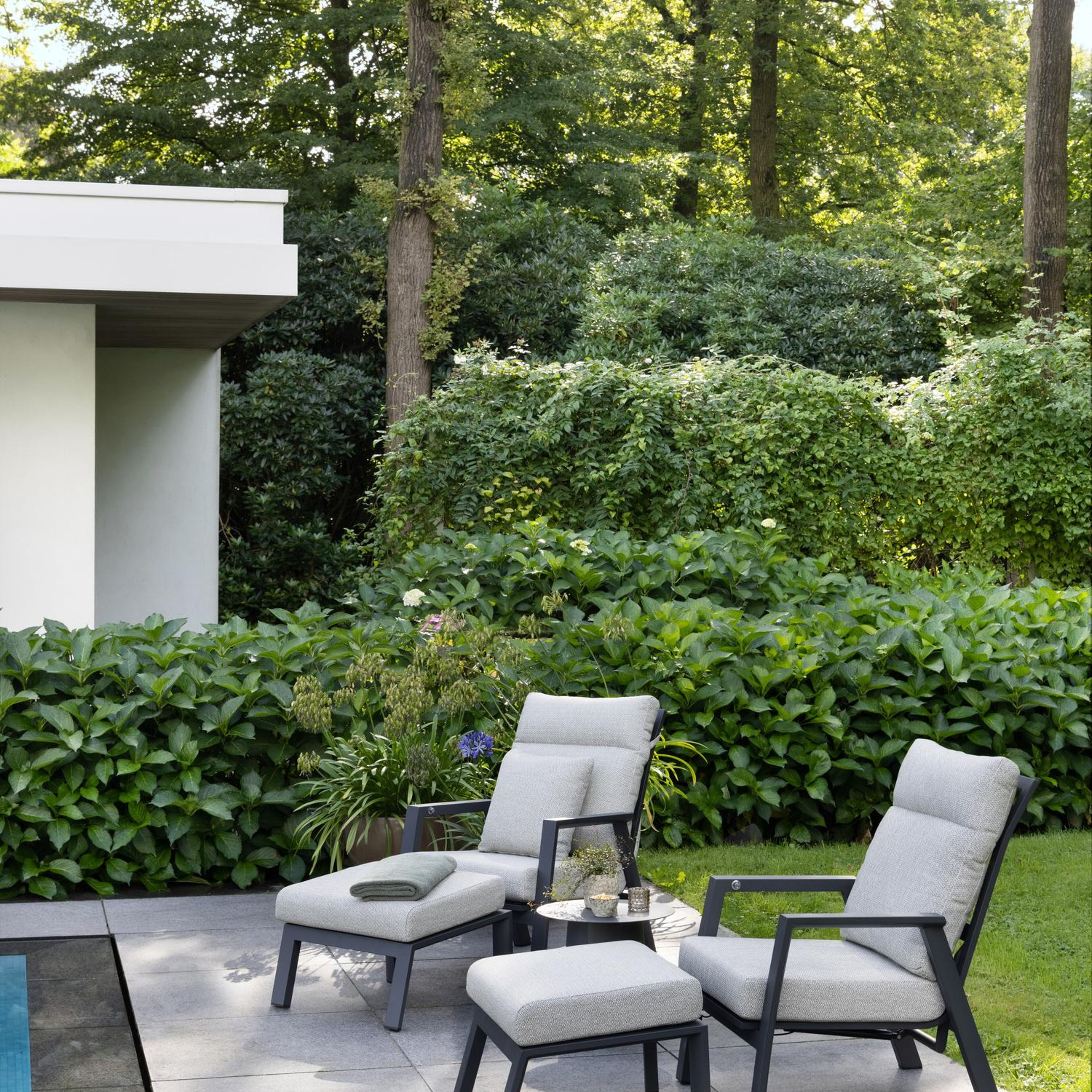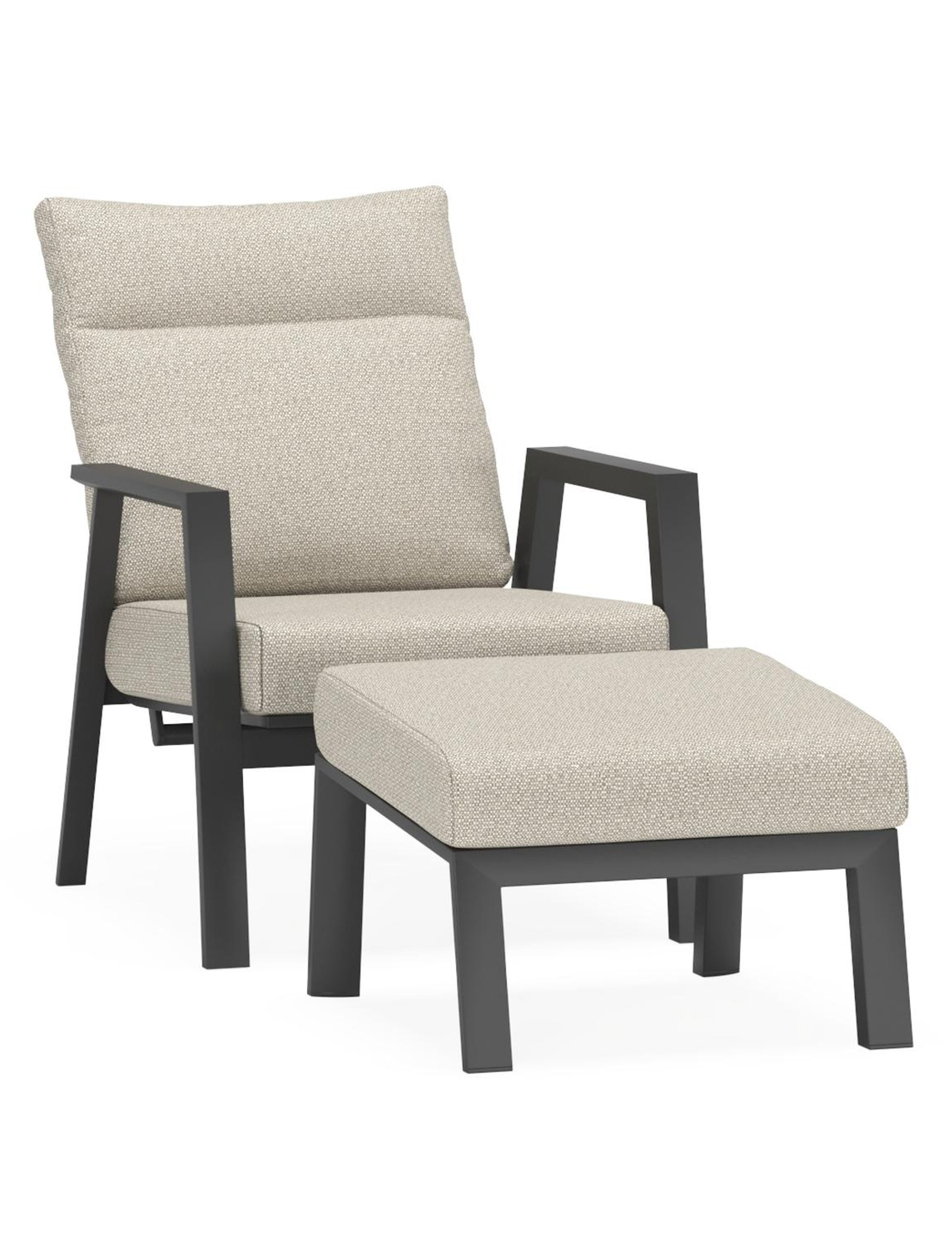 Avila loungestoel 1-zit + poef in zwart aluminium met twilight granite weather+ softtouch kussen | Exterioo tuinmeubelen