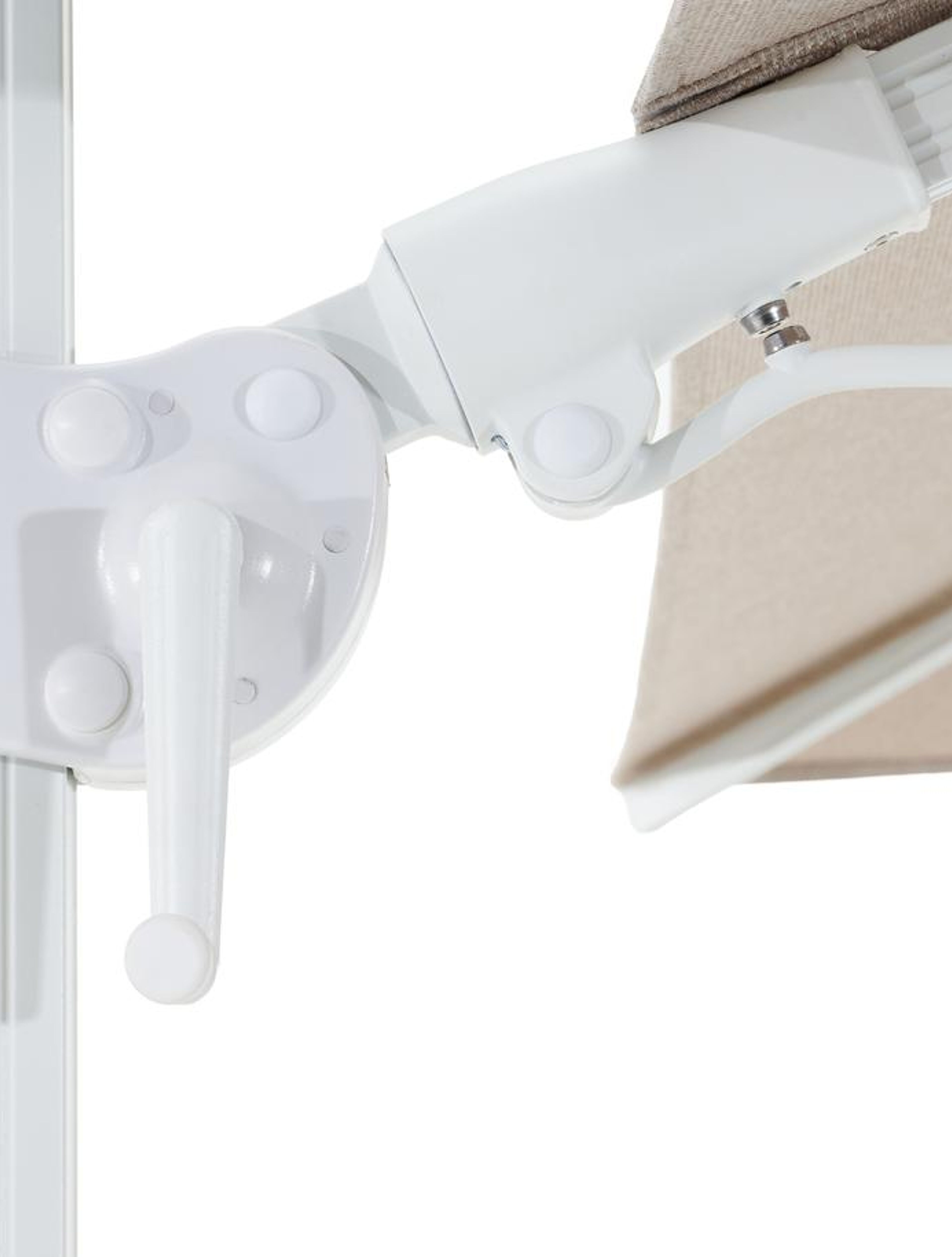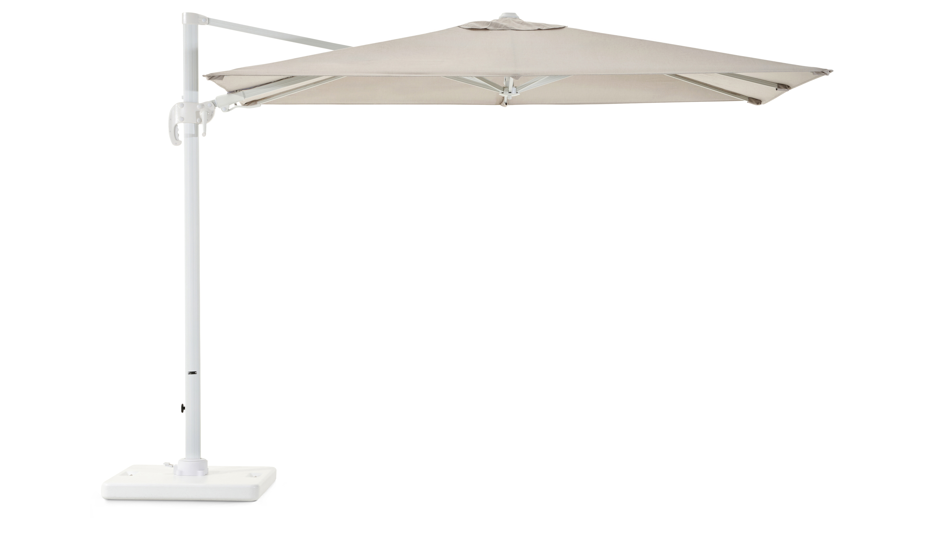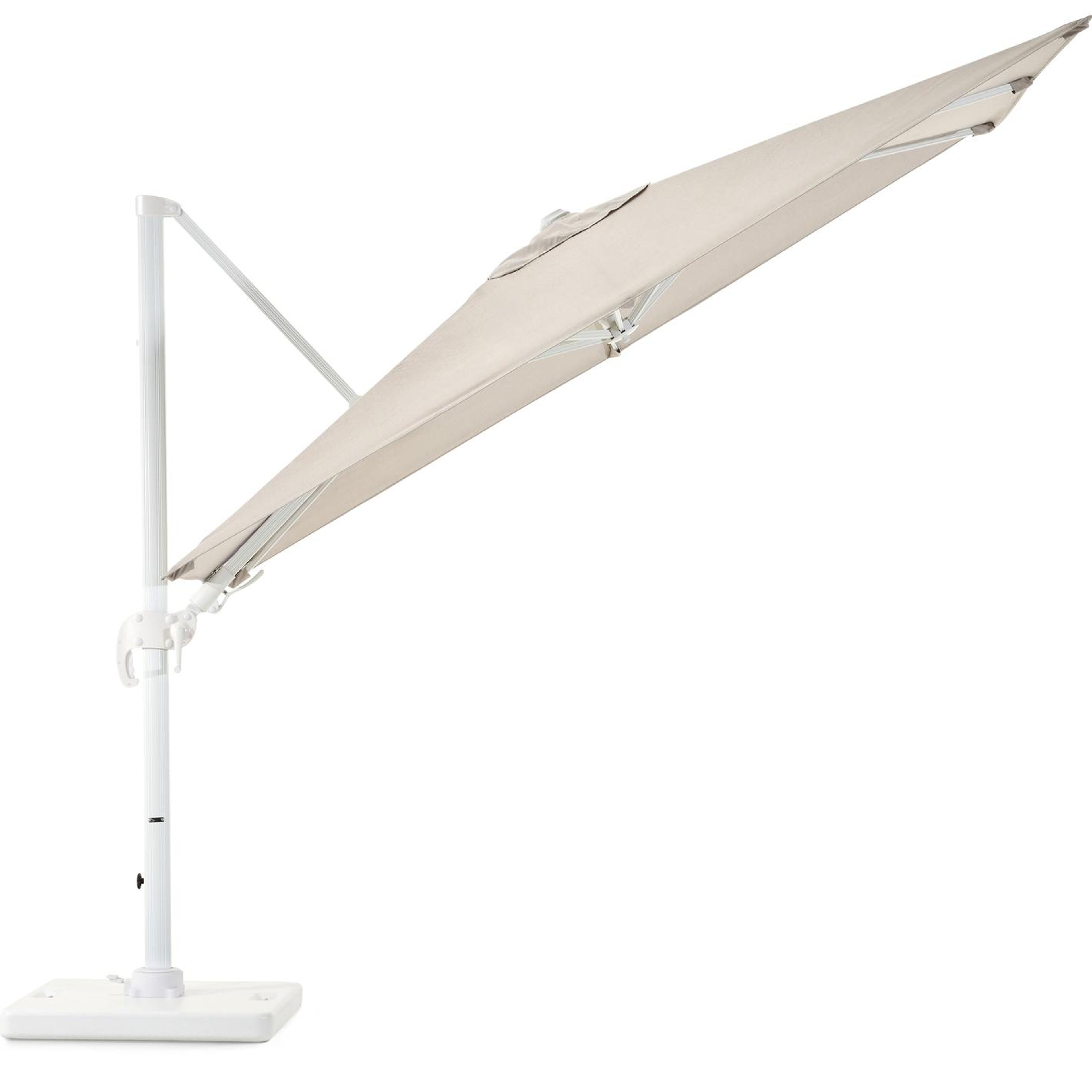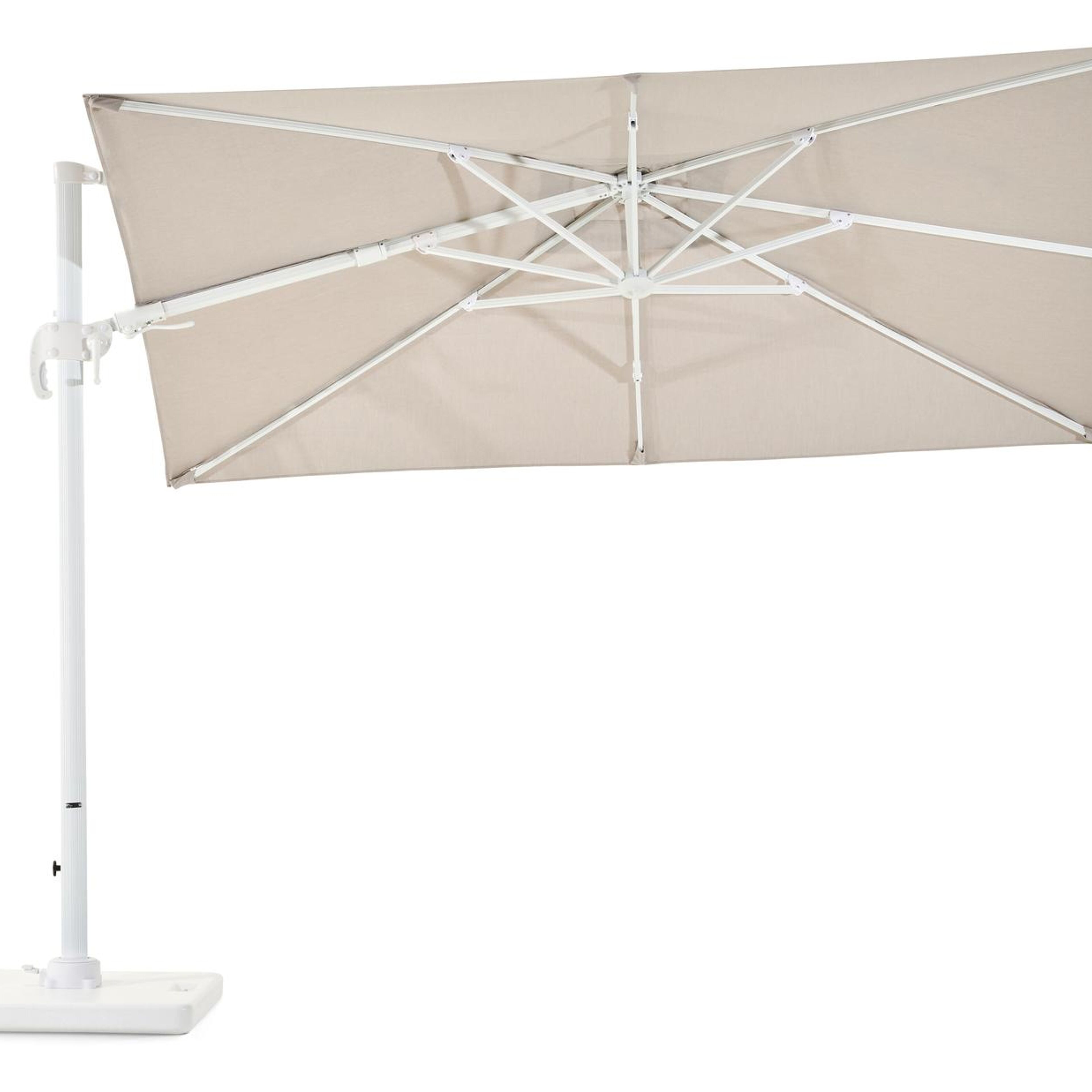 Avola zweefparasol met tiltfunctie in wit aluminium en Natte Graumel Chalk Sunbrella® Premium parasoldoek - L1 200 x L2 300 cm met Pedito parasolvoet 120 kg | Exterioo tuinmeubelen