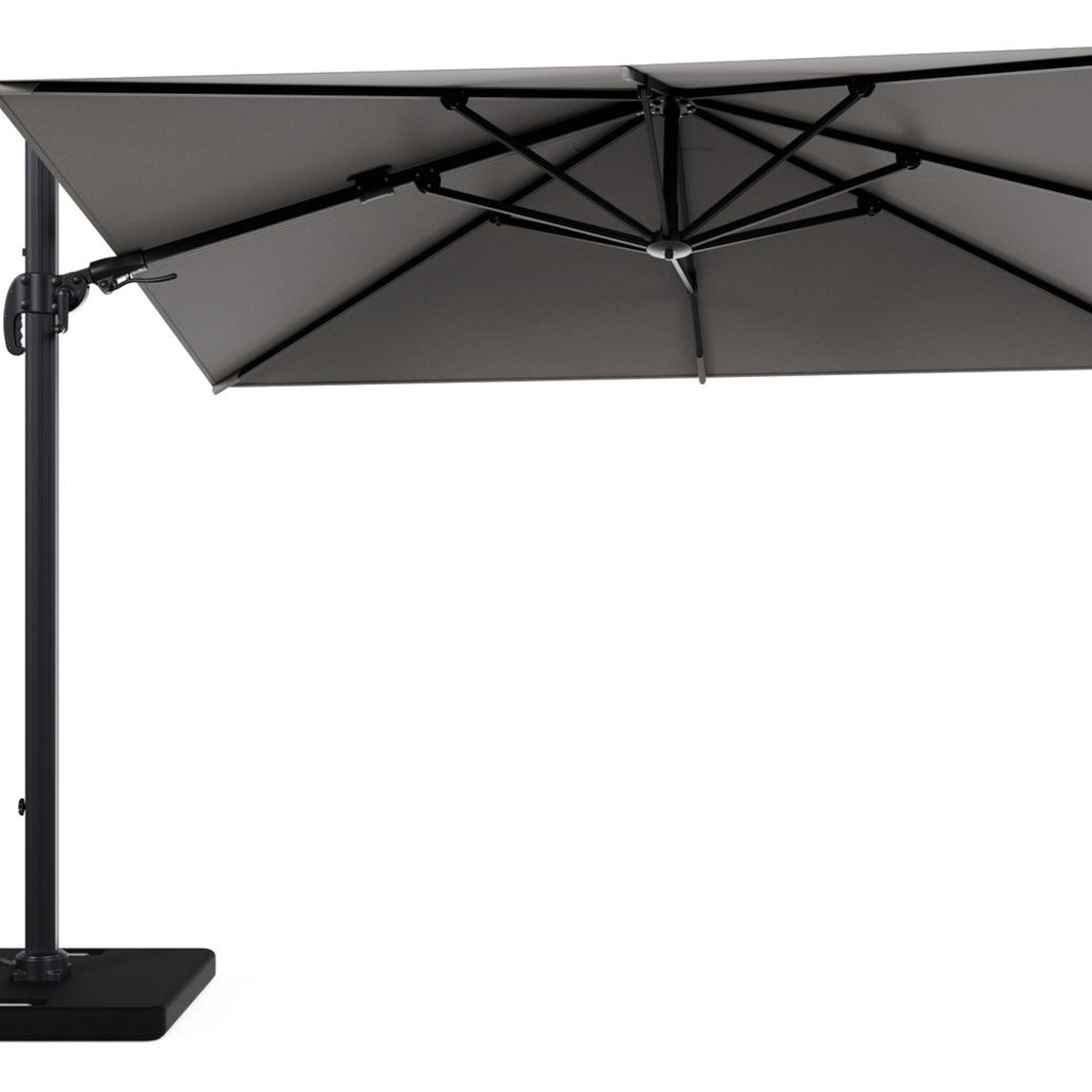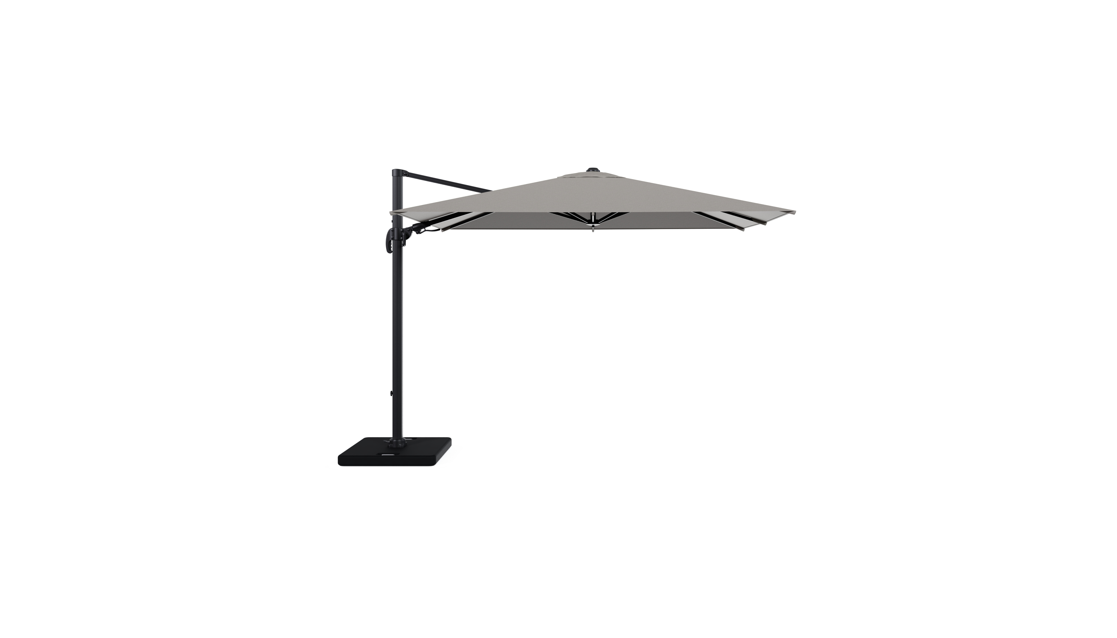 Avola zweefparasol met tiltfunctie in zwart aluminium met grijs weather+ softtouch parasoldoek - L1 200 x L2 300 cm met parasolvoet Pedito 120 kg | Exterioo tuinmeubelen