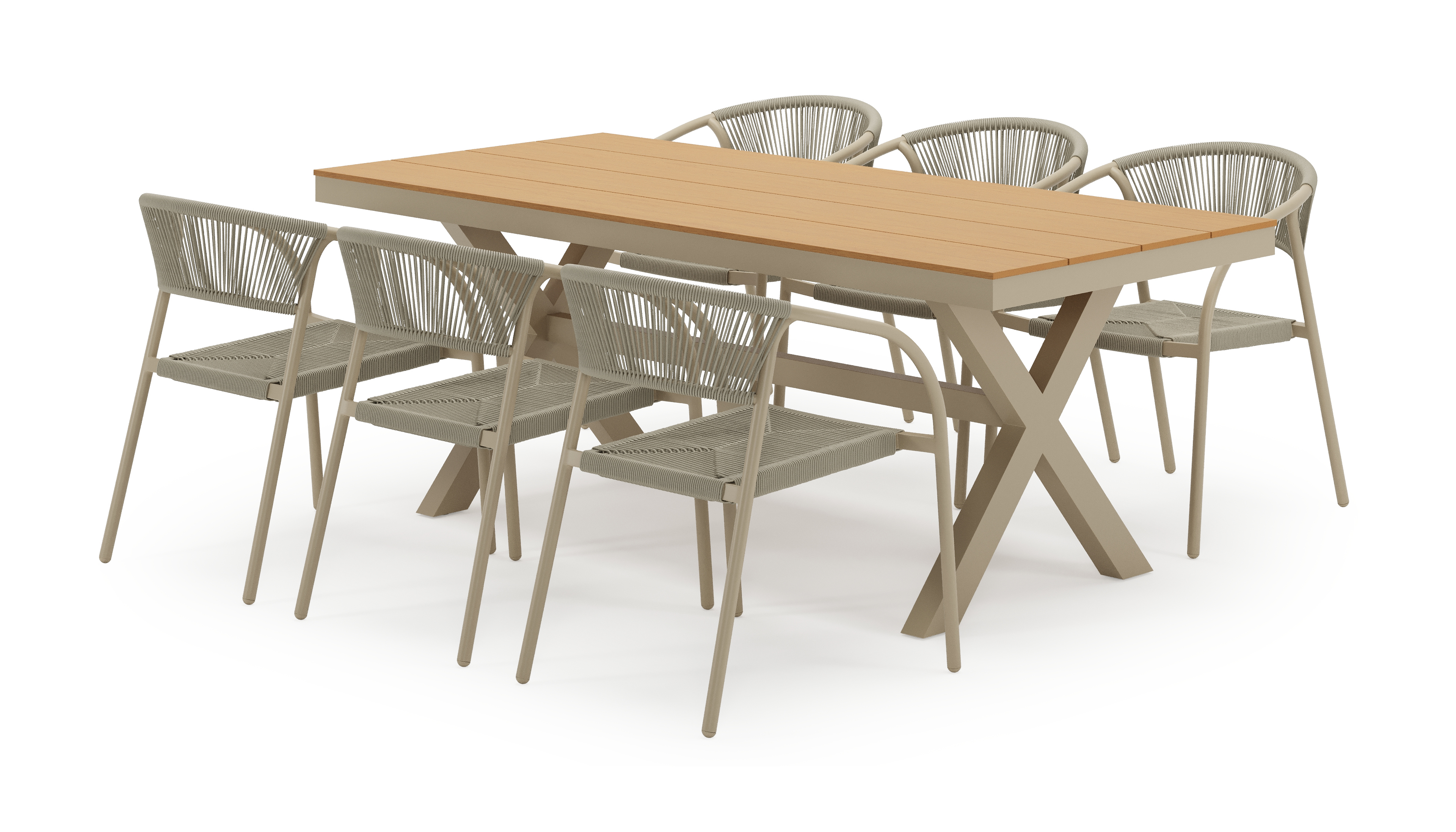 De Bahia tuintafel herken je aan de stevige look en kruispoot. Het frame waarop het tafelblad ligt, is robuust. In het midden van de tafel loopt een balk als extra ondersteuning van het frame.