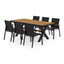 Bahia tuinset herken je aan de stevige look en kruispoot. Het frame waarop het tafelblad ligt, is robuust. In het midden van de tafel loopt een balk als extra ondersteuning van het frame.