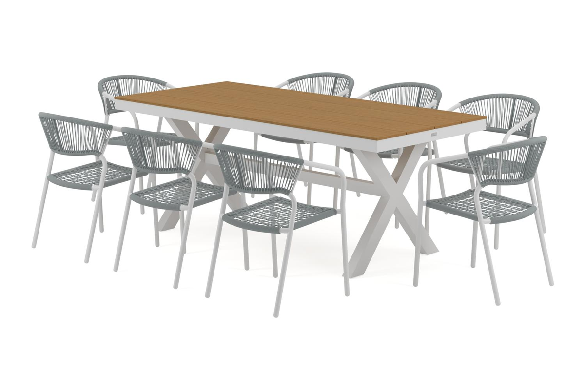 Bahia tuinset herken je aan de stevige look en kruispoot. Het frame waarop het tafelblad ligt, is robuust. In het midden van de tafel loopt een balk als extra ondersteuning van het frame.