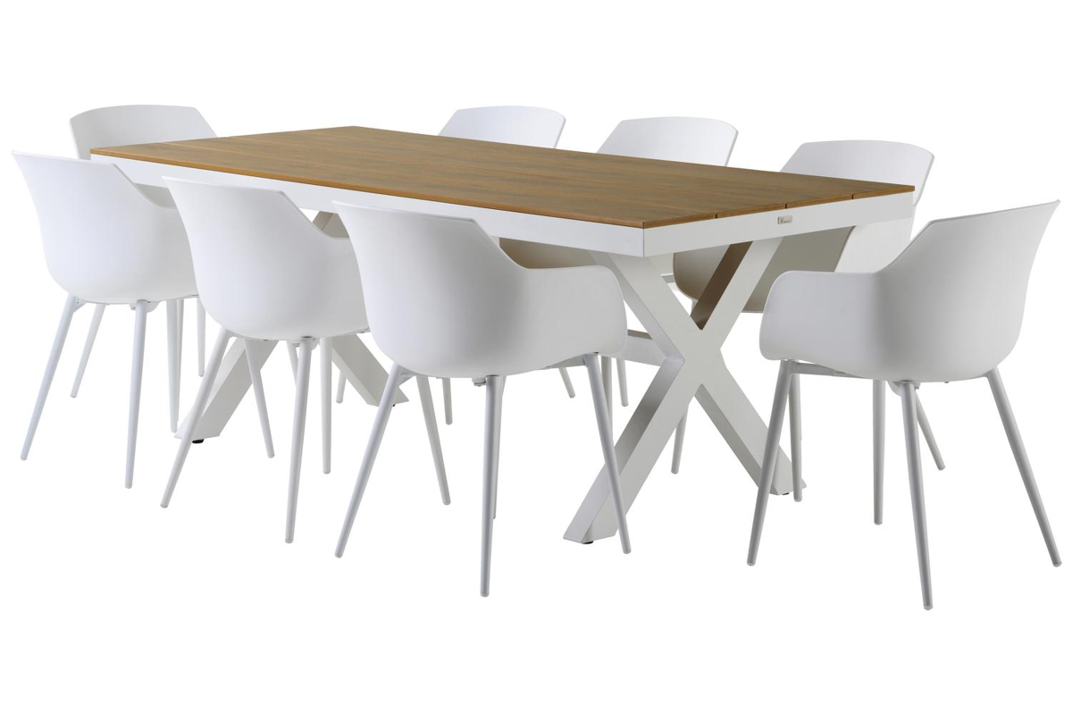 Bahia tuinset herken je aan de stevige look en kruispoot. Het frame waarop het tafelblad ligt, is robuust. In het midden van de tafel loopt een balk als extra ondersteuning van het frame.