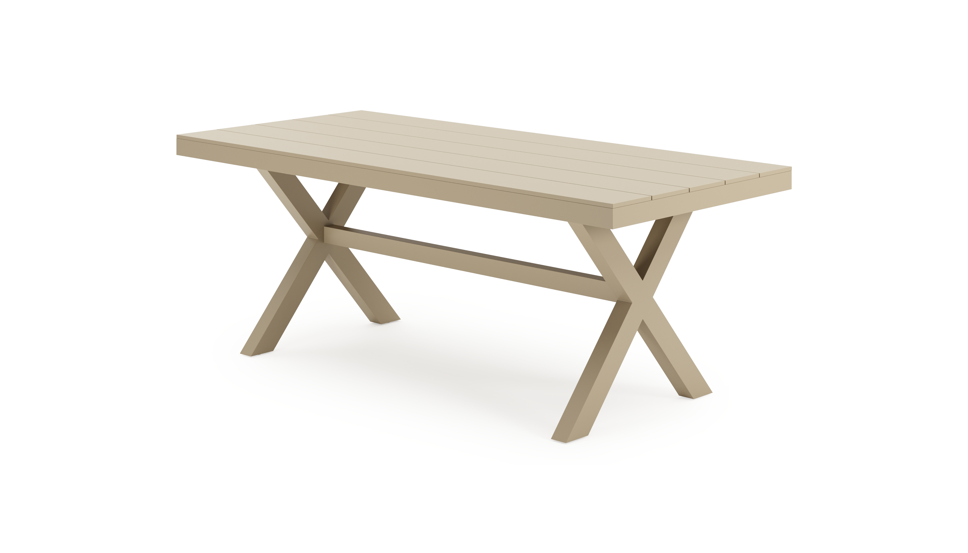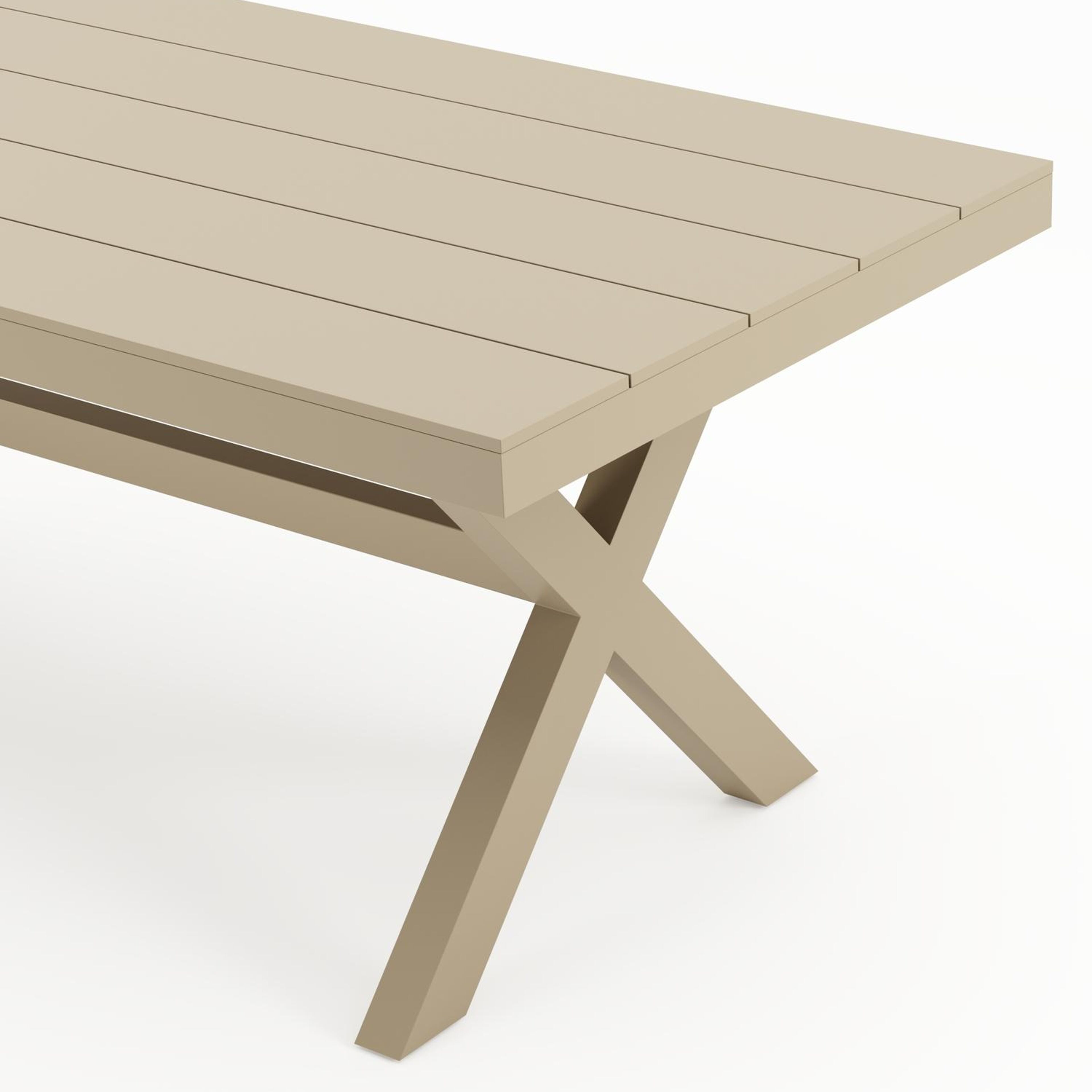 De Bahia tuintafel herken je aan de stevige look en kruispoot. Het frame waarop het tafelblad ligt, is robuust. In het midden van de tafel loopt een balk als extra ondersteuning van het frame.