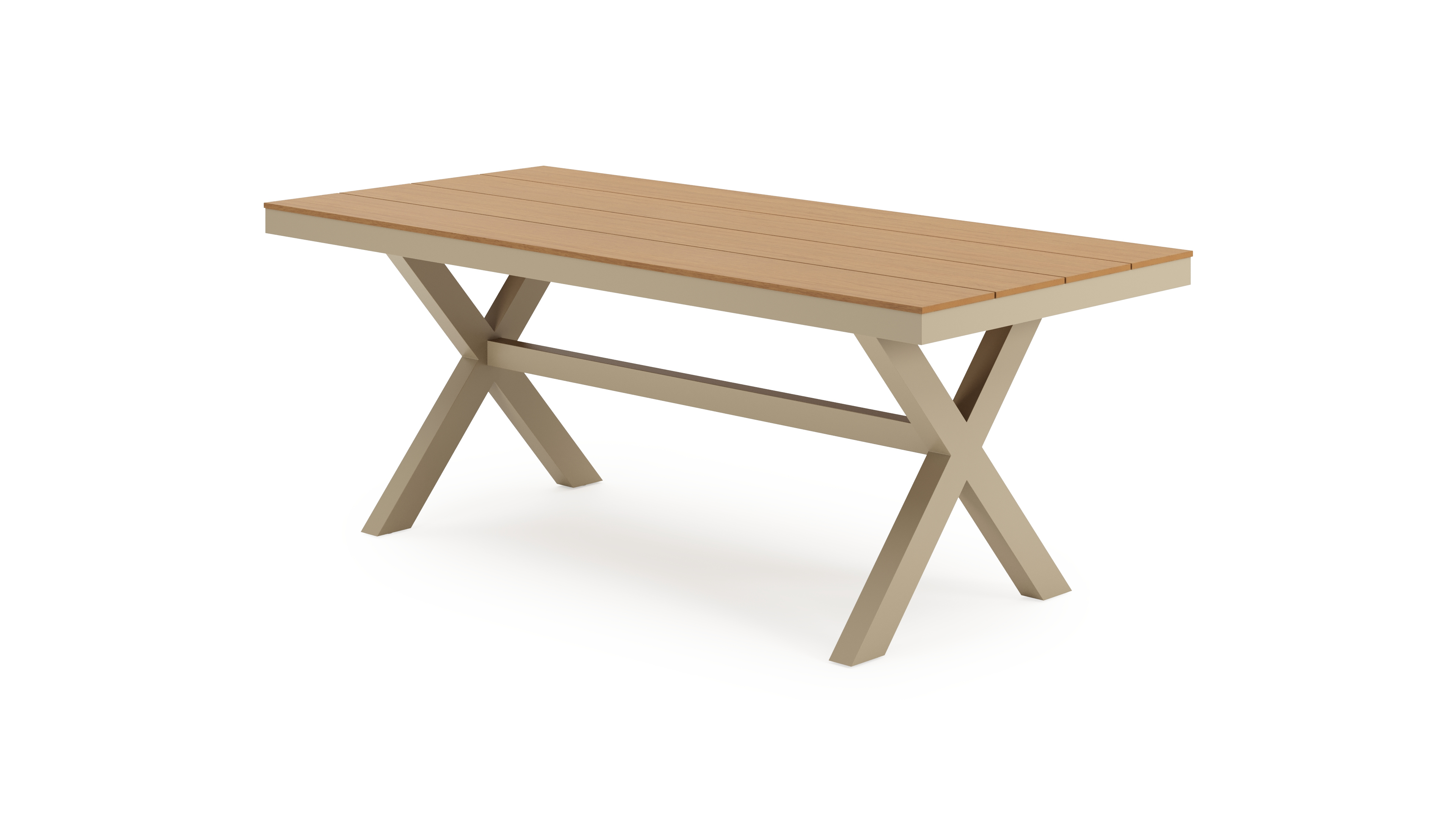 De Bahia tuintafel herken je aan de stevige look en kruispoot. Het frame waarop het tafelblad ligt, is robuust. In het midden van de tafel loopt een balk als extra ondersteuning van het frame.