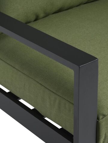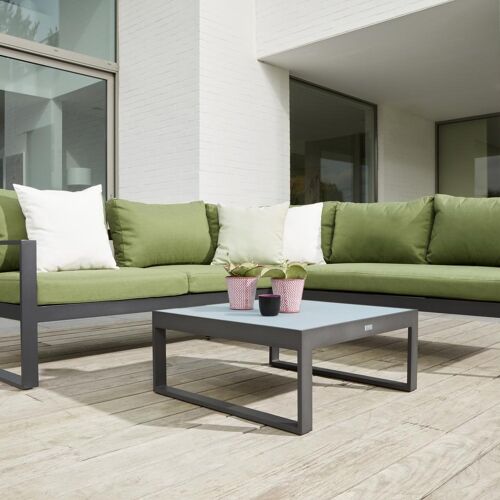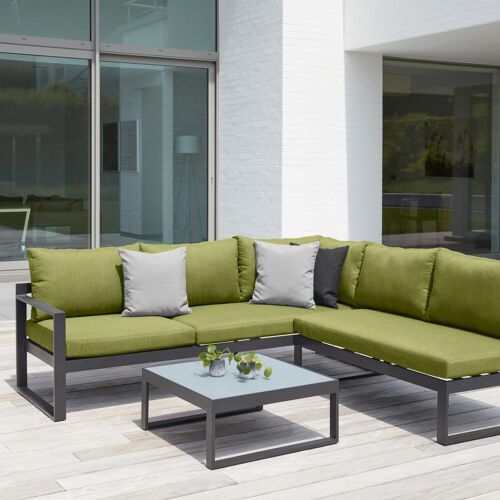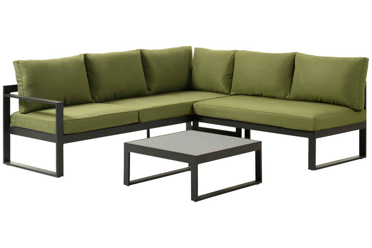 De complete Caldela loungeset is een echte musthave voor op jouw terras. Het frame (zwart/antraciet) gemaakt uit aluminium, zorgt voor een strak ontwerp. De polyester kussens (groen) en loungetafel zijn inbegrepen in de set. Het aantal zitplaatsen is voorzien voor 4 personen. Met de Caldela loungeset geniet je optimaal van jouw buitenmoment aan een scherpe prijs. De afmetingen zijn: L1: 214 x L2: 200 x H 63 cm.