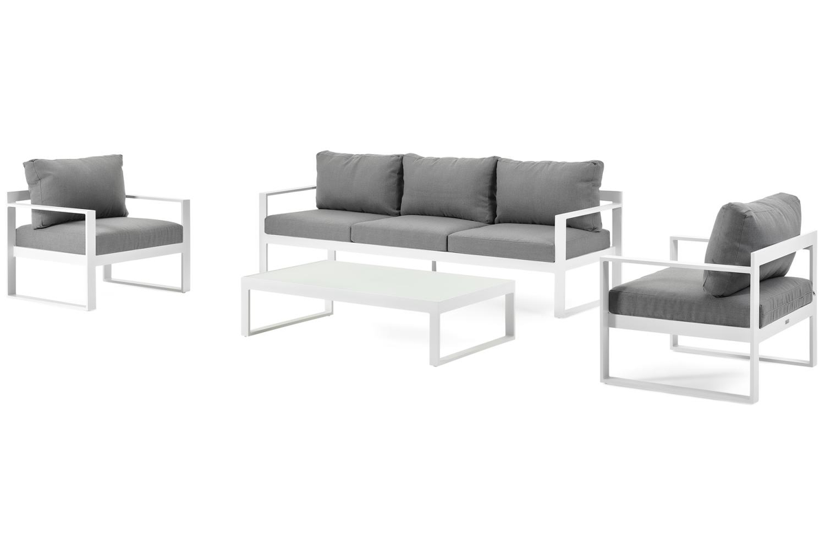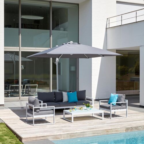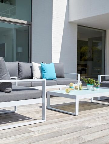 De loungetafel is inbegrepen in de loungeset en heeft een roestvrij aluminium frame en een gehard glazen tafelblad. Het tafelblad is zeer makkelijk te reinigen met een gewone doek, en is dus ideaal tegen vlekken. Het gehard glas is tot 5 keer sterker dan gewoon glas.