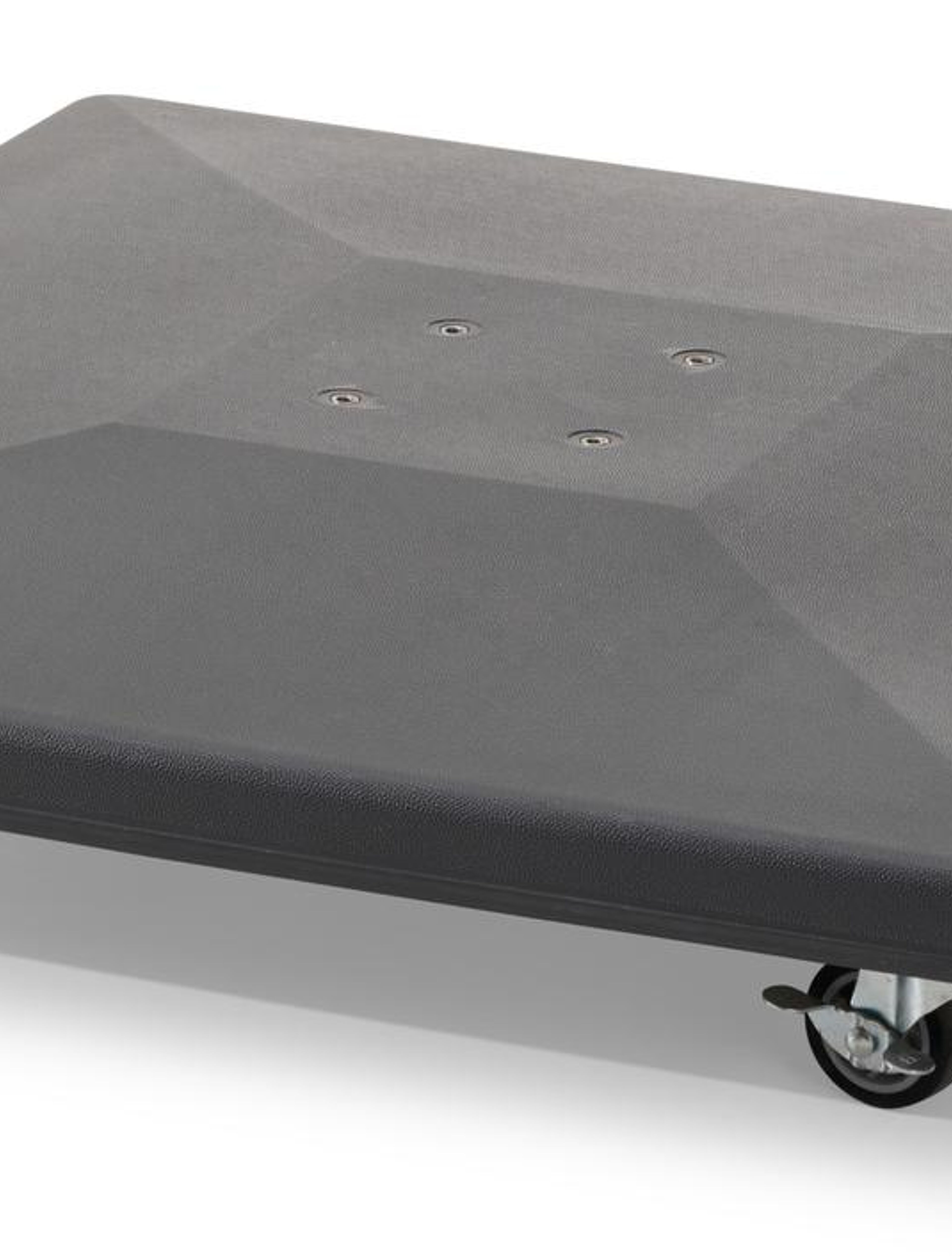 De parasolvoet uit beton met wielen is inclusief zodat je de parasol makkelijk kan verplaatsen.