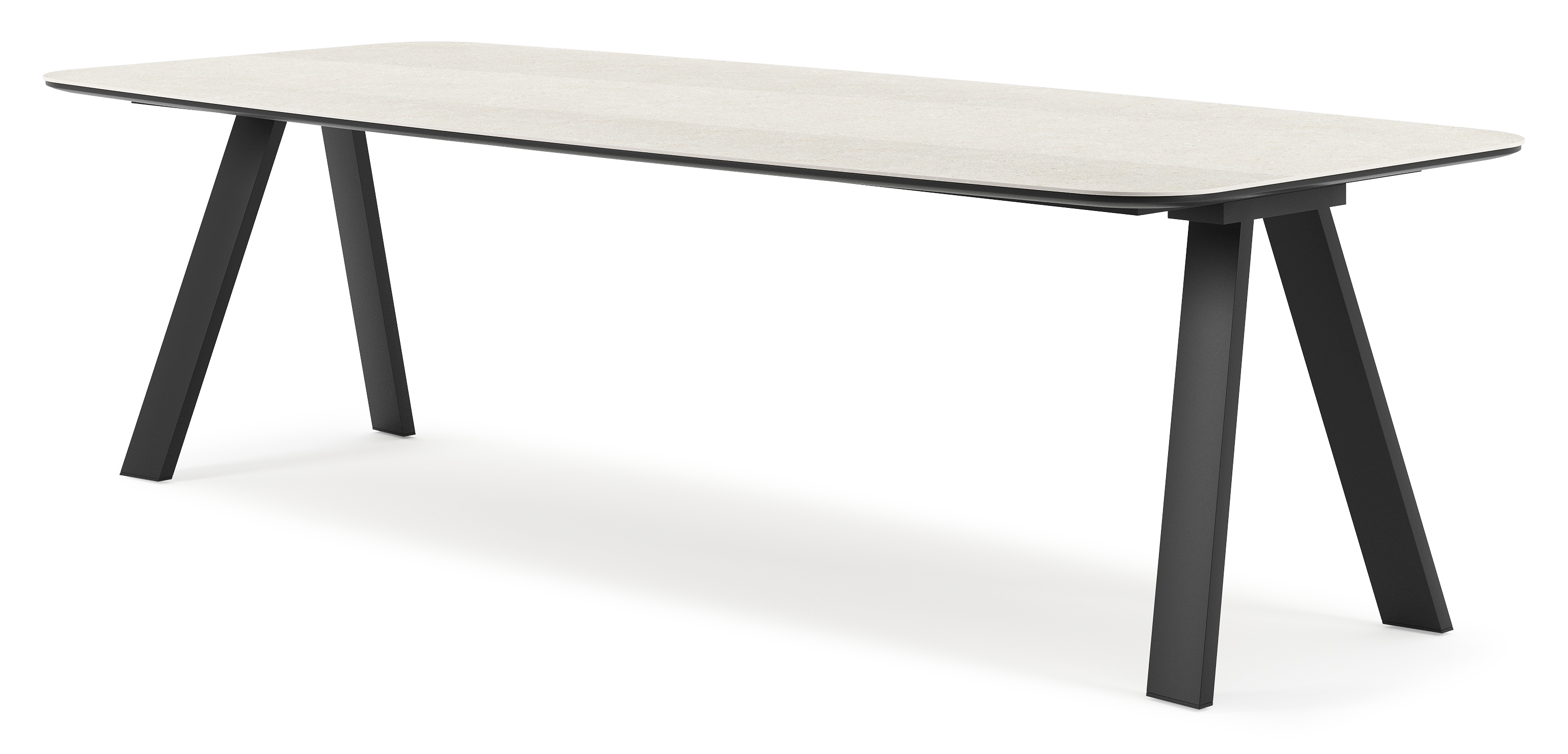 De Cesano tafel onderscheidt zich door zijn stijlvolle onderstel met omgekeerde V-poten, wat een eigentijdse en elegante uitstraling geeft. Met zijn tijdloze charme voegt de Cesano tafel een vleugje moderne klasse toe aan elk interieur.