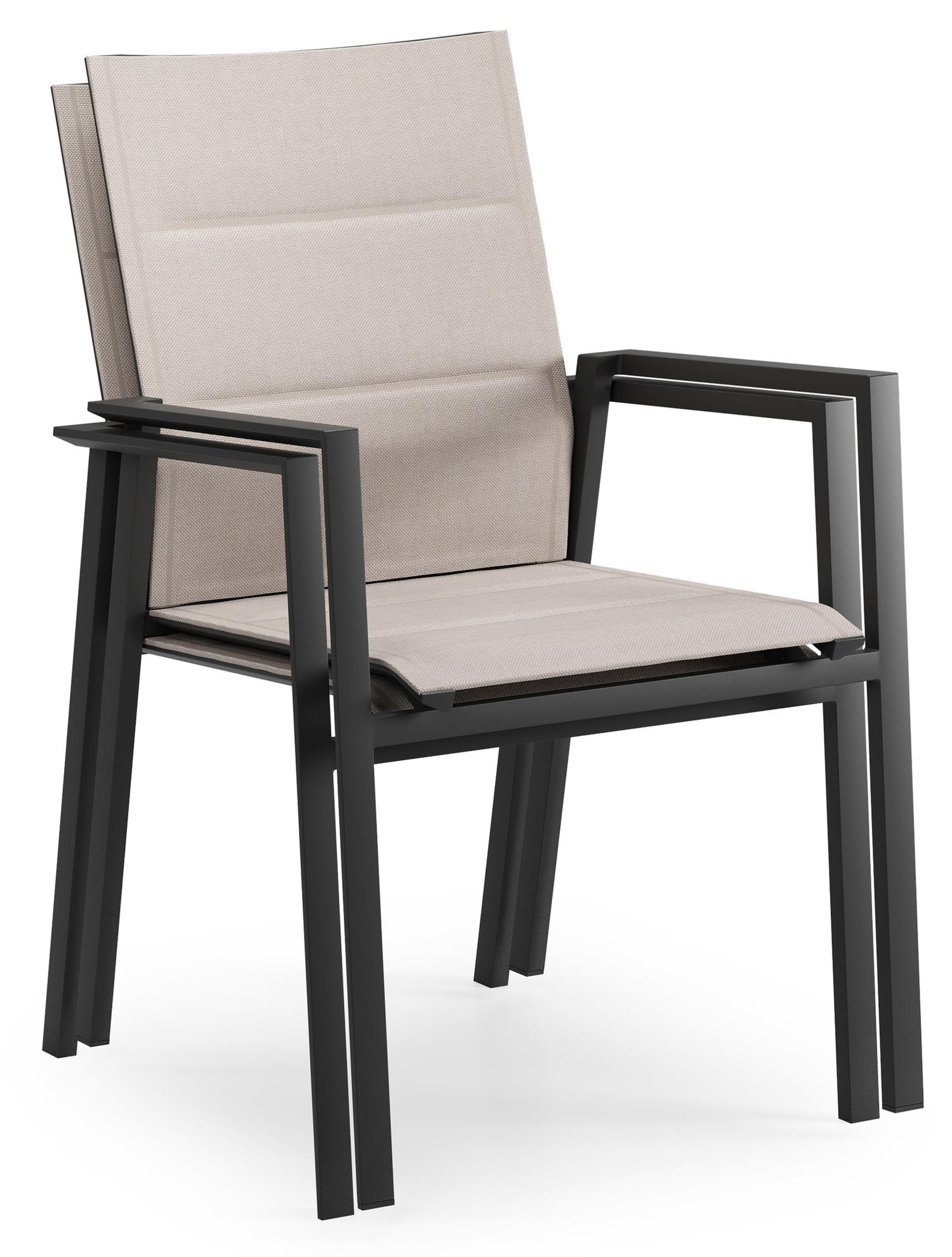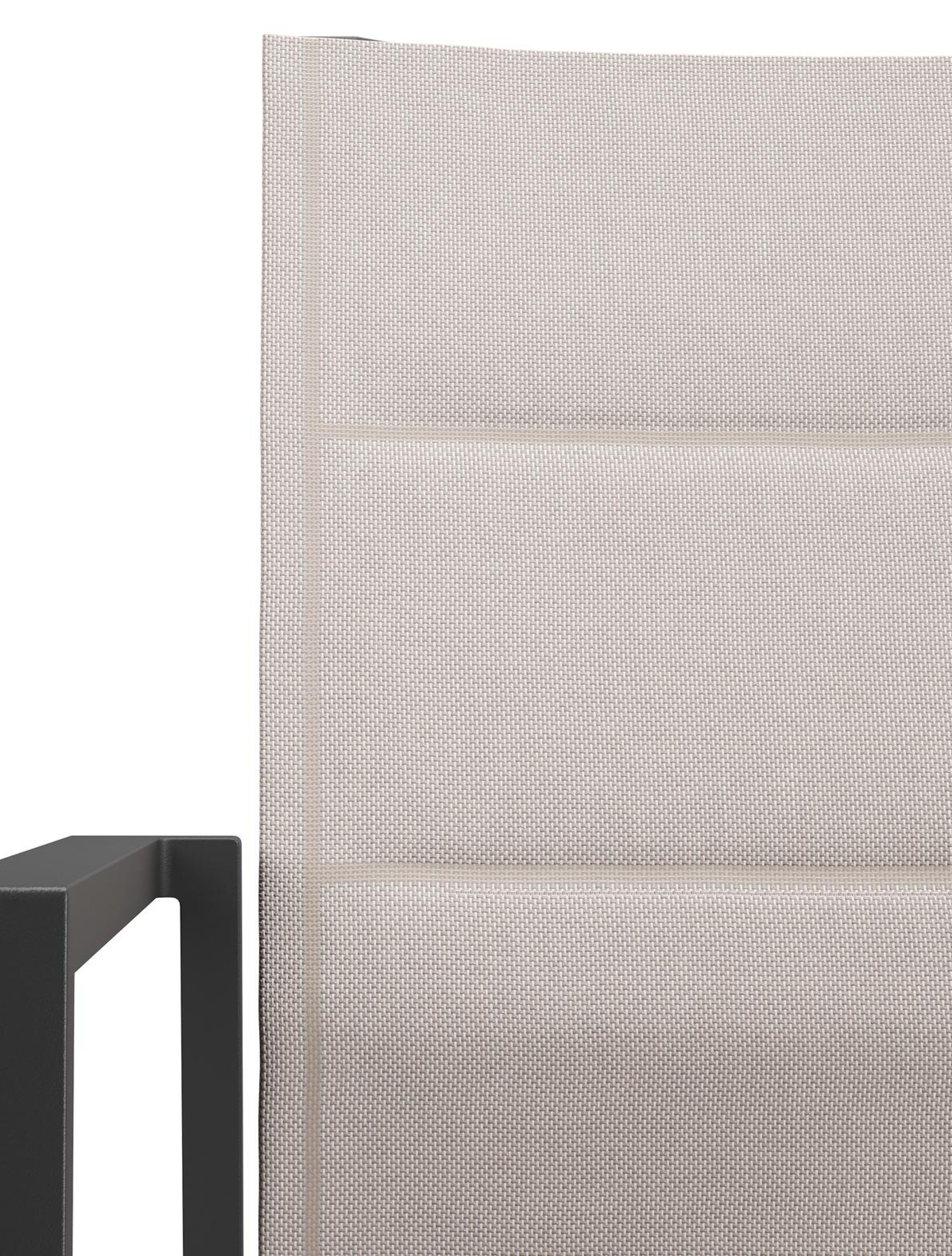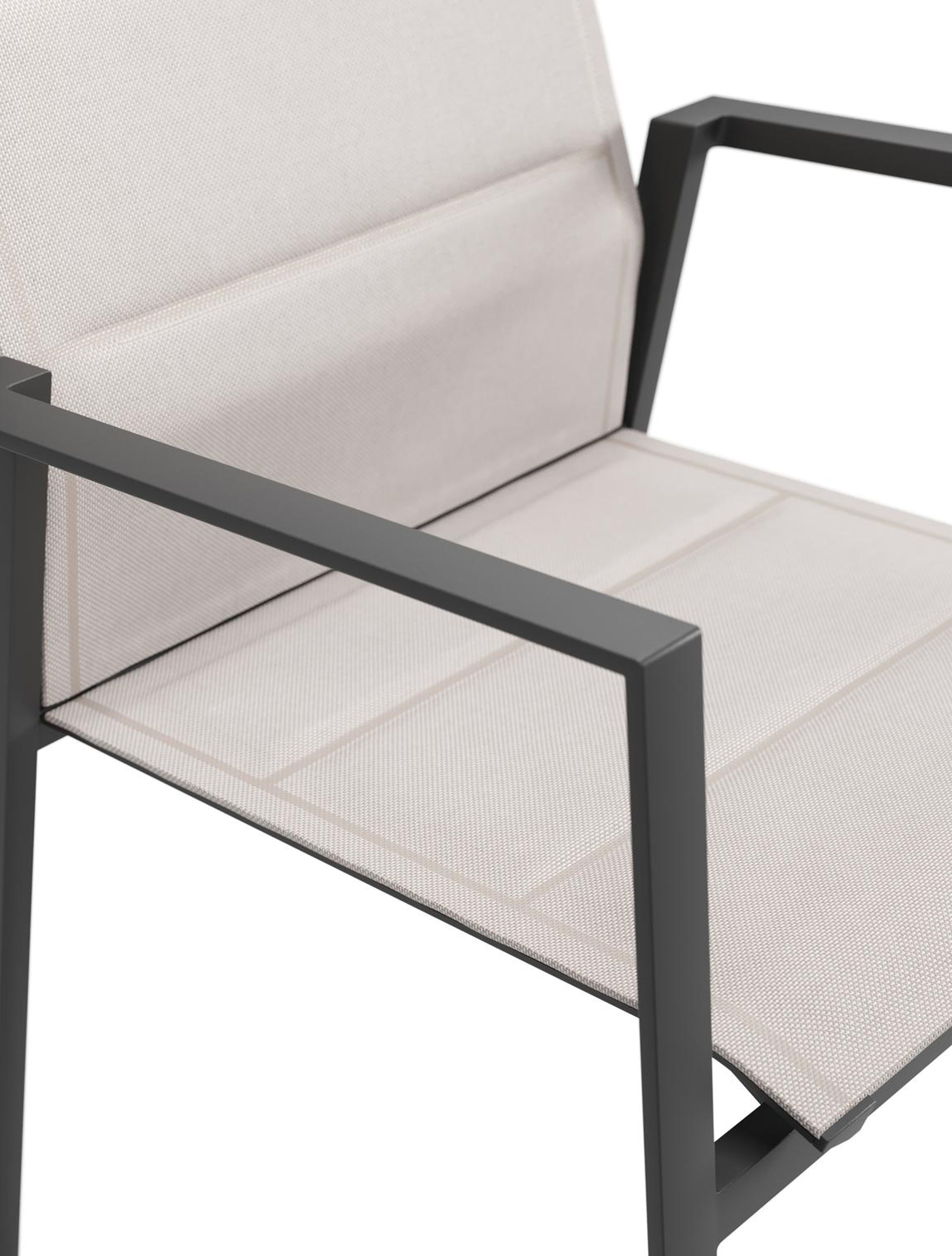 Het frame van de tuinstoel is gemaakt uit roestvrij aluminium, een sterk, maar toch licht materiaal dat makkelijk verplaatsbaar is. Het oppervlak is glad afgewerkt waardoor het geen vuil aantrekt en onderhoudsvriendelijk is. De poedercoating zorgt voor de UV- en weerbestendigheid van je meubel.Textileen is een bekleding die bestaat uit polyester draden met een pvc-coating. textileen is een weerbestendig, vormvast en sneldrogend materiaal. Dankzij de open structuur is het een ademende bekleding en de elasticiteit garandeert een geweldig zitcomfort. De samenstelling maakt het tevens een erg duurzaam materiaal. Dubbele textileen omgeeft het zitvlak en de rugleuning om een gedetailleerde afwerking te garanderen. Tussen de lagen textileen is er een sneldrogende schuimlaag.
