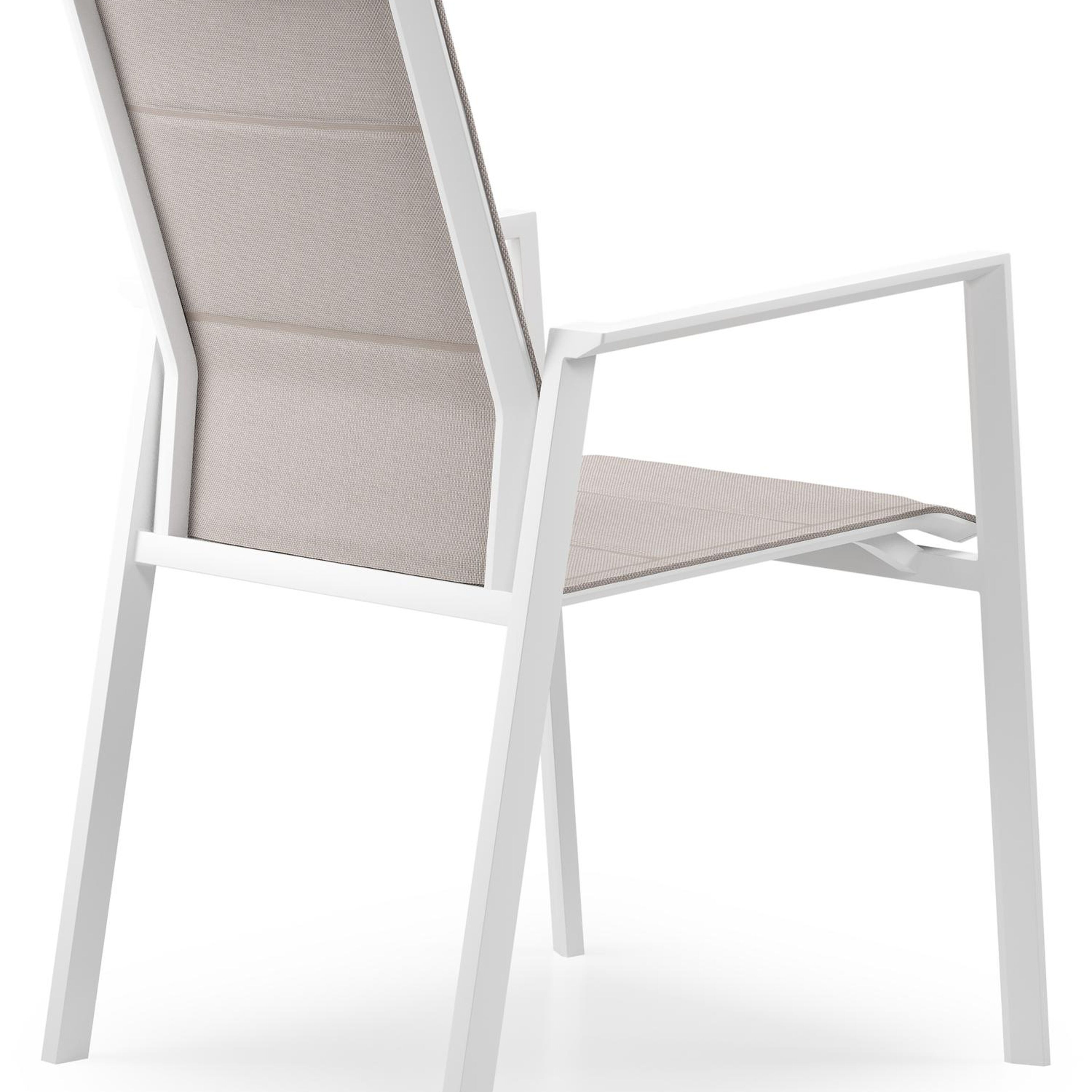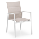 Het frame van de tuinstoel is gemaakt uit roestvrij aluminium, een sterk, maar toch licht materiaal dat makkelijk verplaatsbaar is. Het oppervlak is glad afgewerkt waardoor het geen vuil aantrekt en onderhoudsvriendelijk is. De poedercoating zorgt voor de UV- en weerbestendigheid van je meubel.Textileen is een bekleding die bestaat uit polyester draden met een pvc-coating. textileen is een weerbestendig, vormvast en sneldrogend materiaal. Dankzij de open structuur is het een ademende bekleding en de elasticiteit garandeert een geweldig zitcomfort. De samenstelling maakt het tevens een erg duurzaam materiaal. Dubbele textileen omgeeft het zitvlak en de rugleuning om een gedetailleerde afwerking te garanderen. Tussen de lagen textileen is er een sneldrogende schuimlaag.