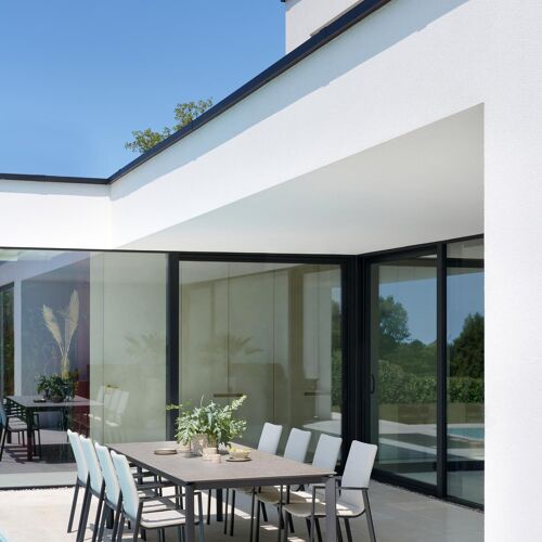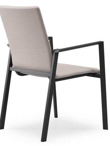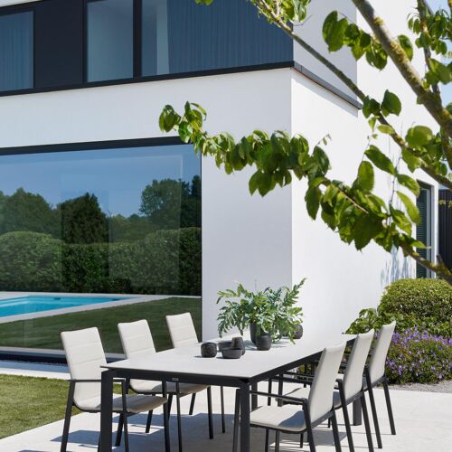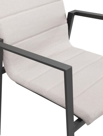 Het frame van de tuinstoel is gemaakt uit roestvrij aluminium, een sterk, maar toch licht materiaal dat makkelijk verplaatsbaar is. Het oppervlak is glad afgewerkt waardoor het geen vuil aantrekt en onderhoudsvriendelijk is. De poedercoating zorgt voor de UV- en weerbestendigheid van je meubel.textileen is een bekleding die bestaat uit polyester draden met een pvc-coating. Textileen is een weerbestendig, vormvast en sneldrogend materiaal. Dankzij de open structuur is het een ademende bekleding en de elasticiteit garandeert een geweldig zitcomfort. De samenstelling maakt het tevens een erg duurzaam materiaal. Luxe textileen omgeeft het zitvlak en de rugleuning om een gedetailleerde afwerking te garanderen. Daarnaast is de afwerking compleet met de elegante siernaden. Tussen de lagen textileen is er een sneldrogende schuimlaag.