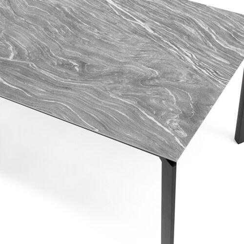 De Cirello tafel heeft een modern design. De tafelpoten staan inwaarts gericht naar het middelpunt van de tafel. Bovendien zorgt het frame ervoor dat het tafelblad zweeft boven het frame. Het frame is gemaakt van aluminium een licht, maar sterk en roestvrij materiaal dat zeer geschikt is voor tuinmeubelen. Deze tafel is afgewerkt met een Mar Del Plata tafelblad. Een uniek tafelblad waarin de golven van de zee weerspiegelen. In de tafel vind je glinsterende spikkels die zorgen voor een prachtig parelmoereffect. Het voordeel van volkeramische tafelbladen is dat ze krasbestendig zijn en bestand zijn tegen alle weersomstandigheden.