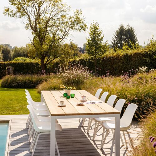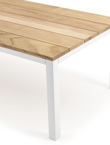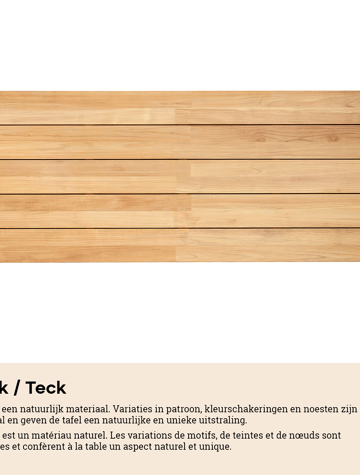 Een tafelblad uit teak staat gelijk aan bijzondere kwaliteit en natuurlijk design. Teak is een kwalitatieve houtsoort gekenmerkt door zijn hardheid. Aangezien hout leeft, kan de structuur of kleur licht anders zijn dan op het beeld weergegeven.