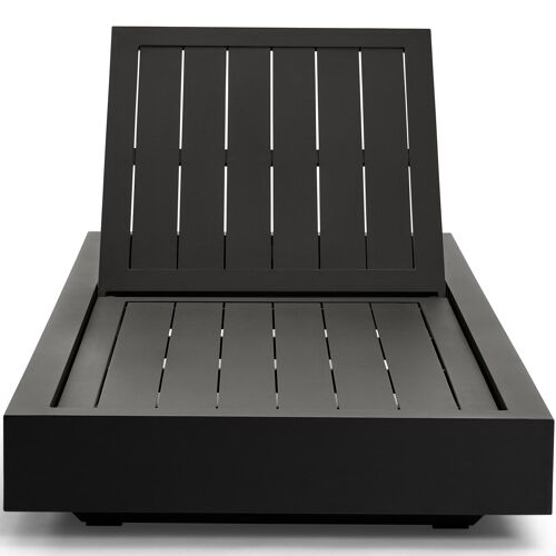 Ligbed in zwart mat aluminium. Met verstelbare rugleuning. L 211 x B 76 x H 25 cm. Met kussen in All Weather kwaliteit: waterbestendige Sunbrella® stof en vulling met Quick Dry Foam. Kleur: Natte Grey Chine. Afmeting: L 205 x B 70 cm.