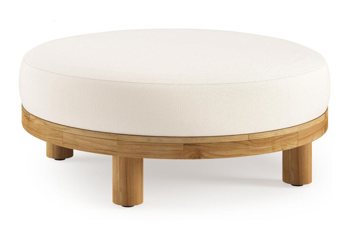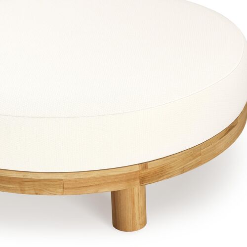 Donato lounge poef in teak en beige verticaal geweven ronde rope met all weather sunbrella® luxe Lopi Snow kussen | Exterioo