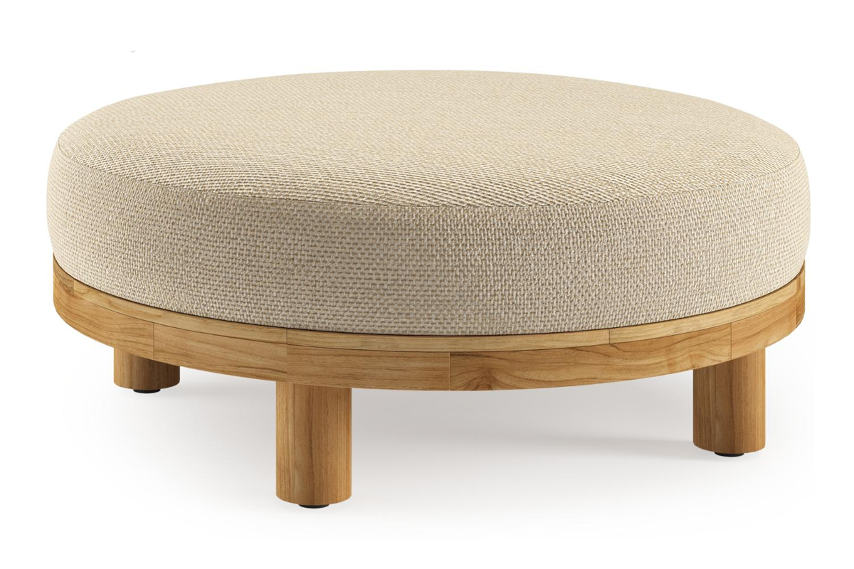 Donato lounge poef in teak en beige verticaal geweven ronde rope met all weather cosytica Althea Camel kussen | Exterioo