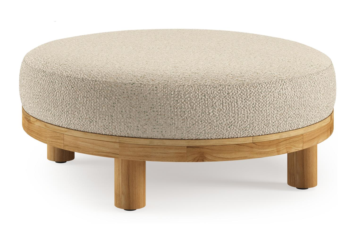 Donato lounge poef in teak en beige verticaal geweven ronde rope met all weather cosytica Bora Forest kussen | Exterioo