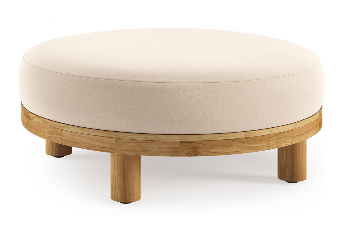 Donato lounge poef in teak en beige verticaal geweven ronde rope met all weather sunbrella® luxe Natte Linen Chalk kussen | Exterioo