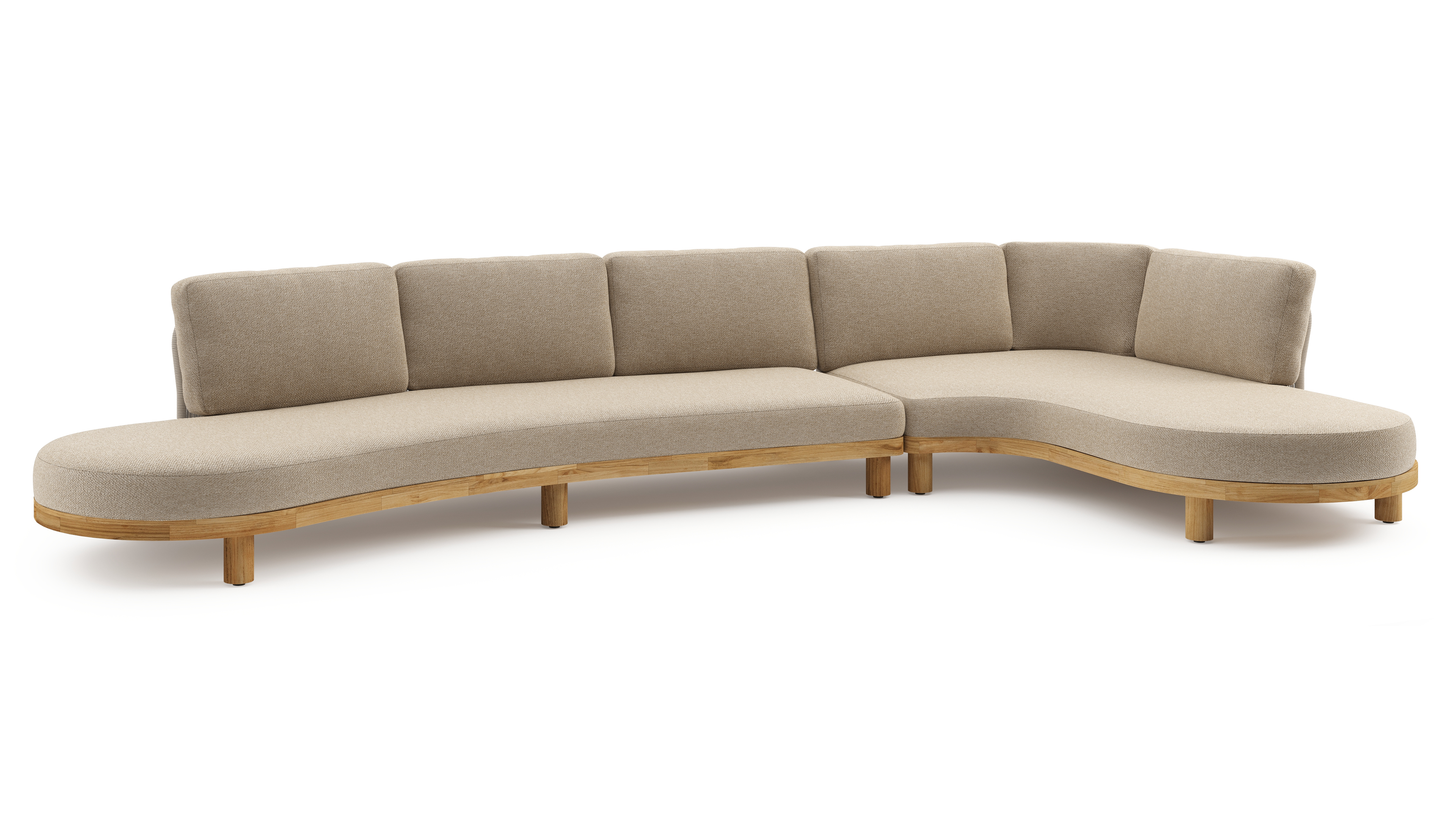 Donato loungehoek in teak en beige verticaal geweven ronde rope met all weather cosytica Madagascar Oak kussen | Exterioo tuinmeubelen