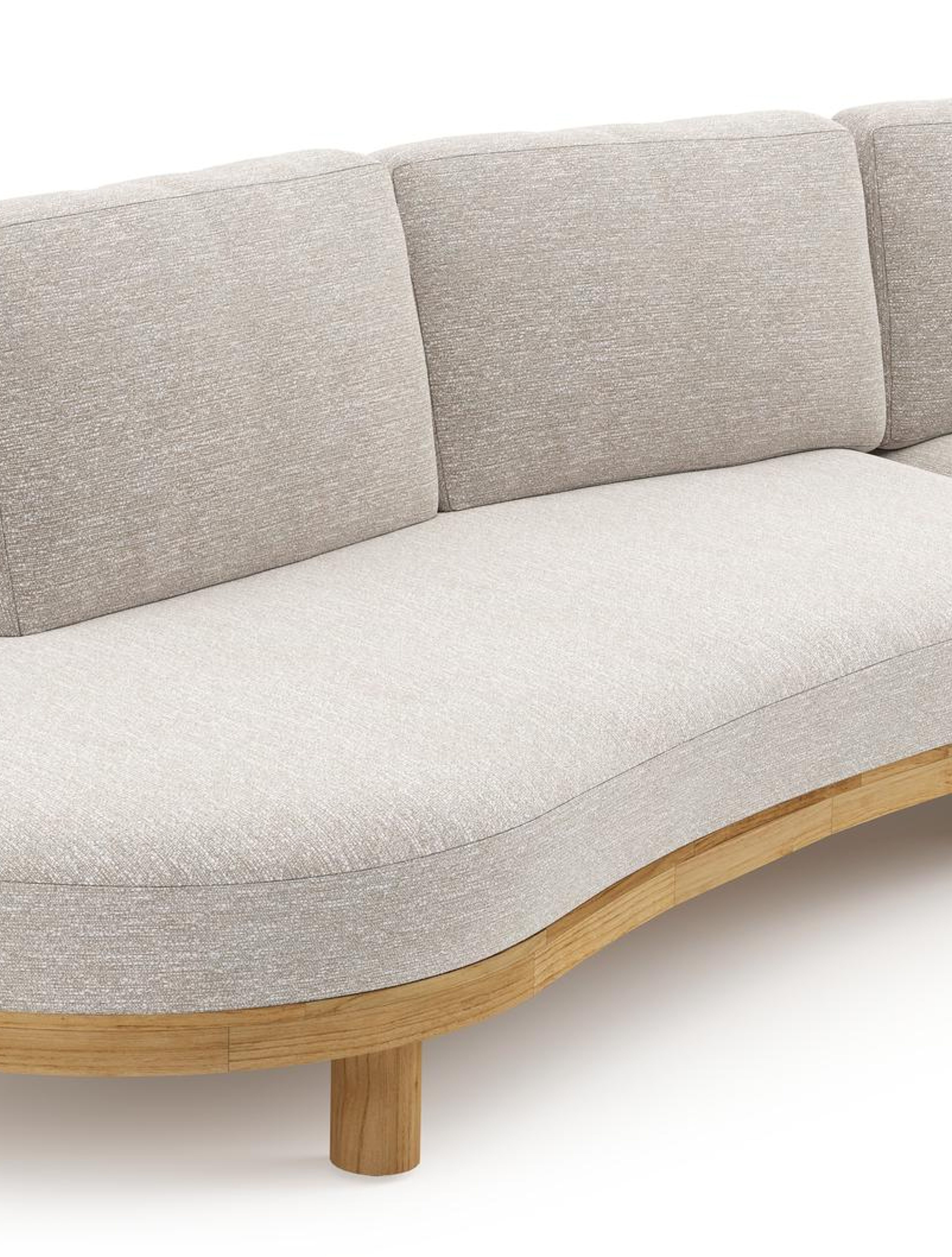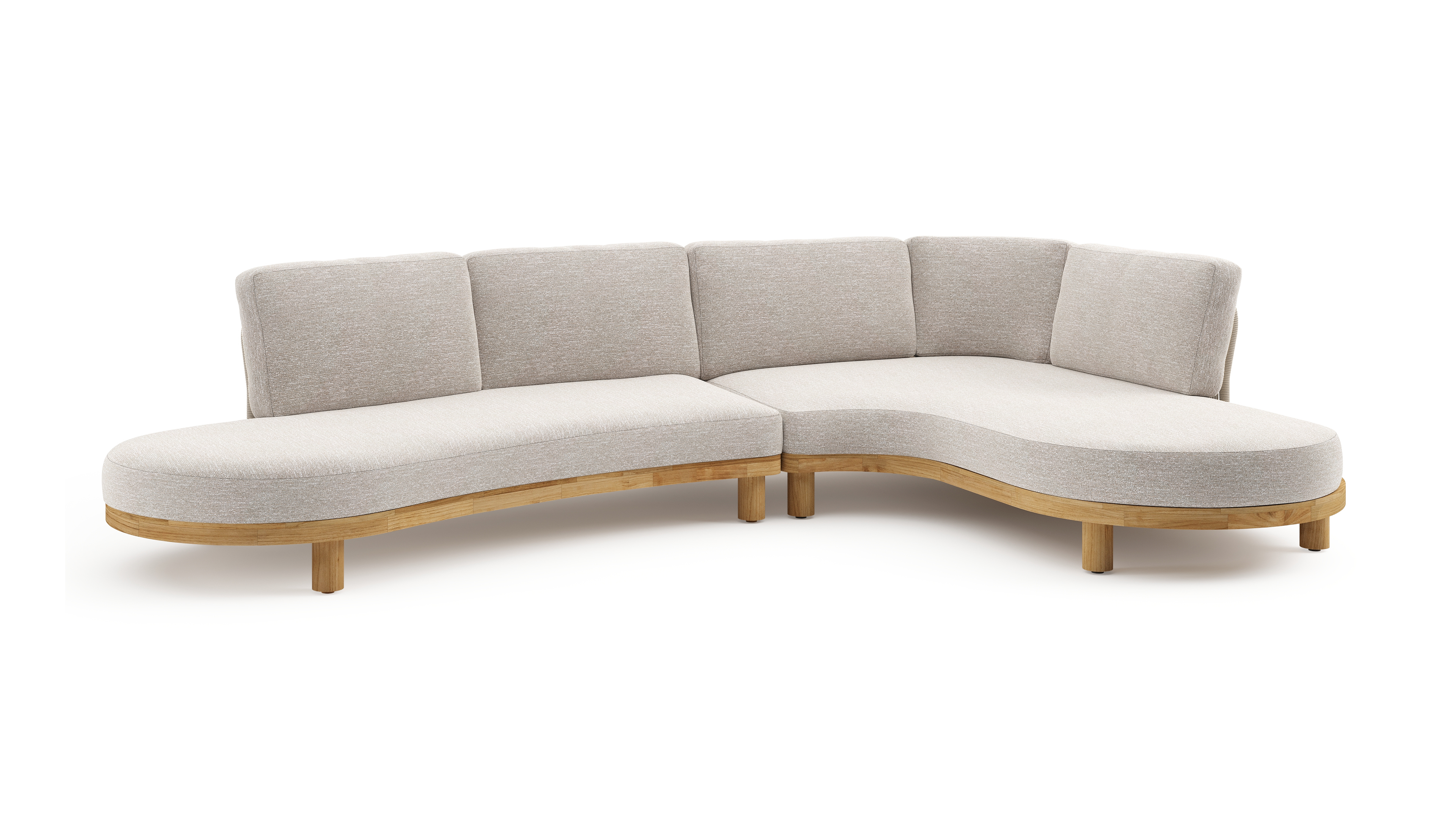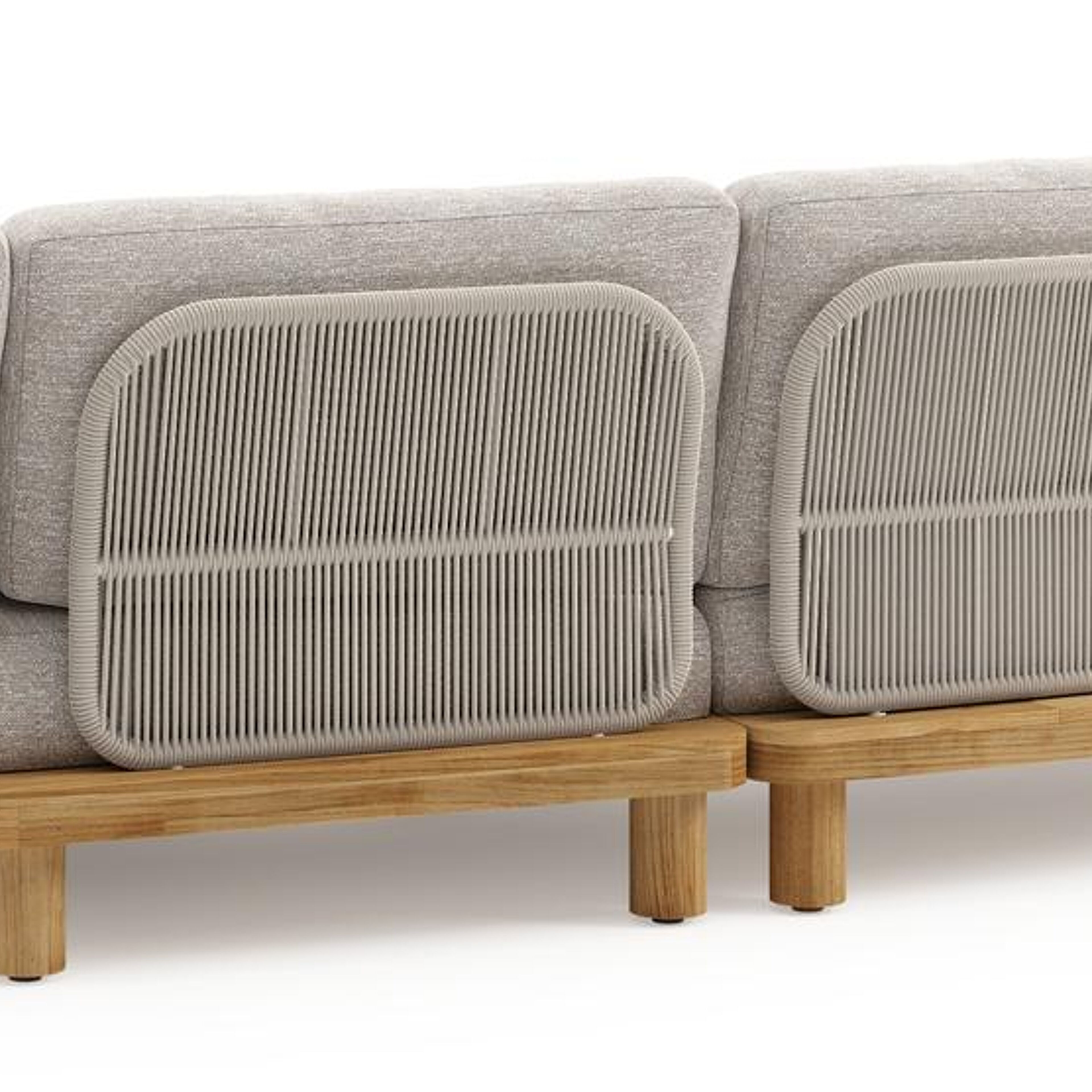 Donato loungehoek in teak en beige verticaal geweven ronde rope met all weather sunbrella® luxe Tundra Sand kussen | Exterioo tuinmeubelen