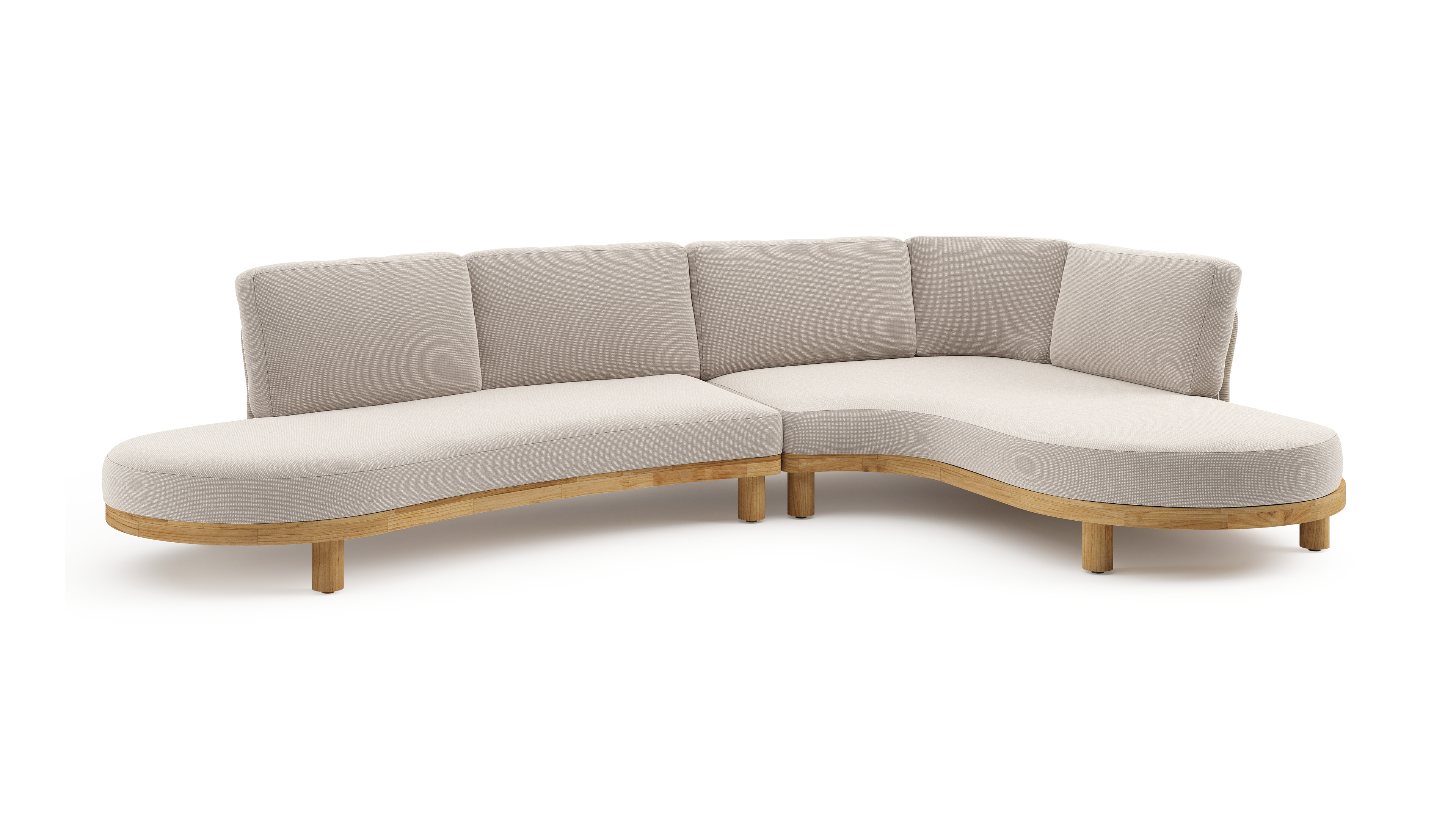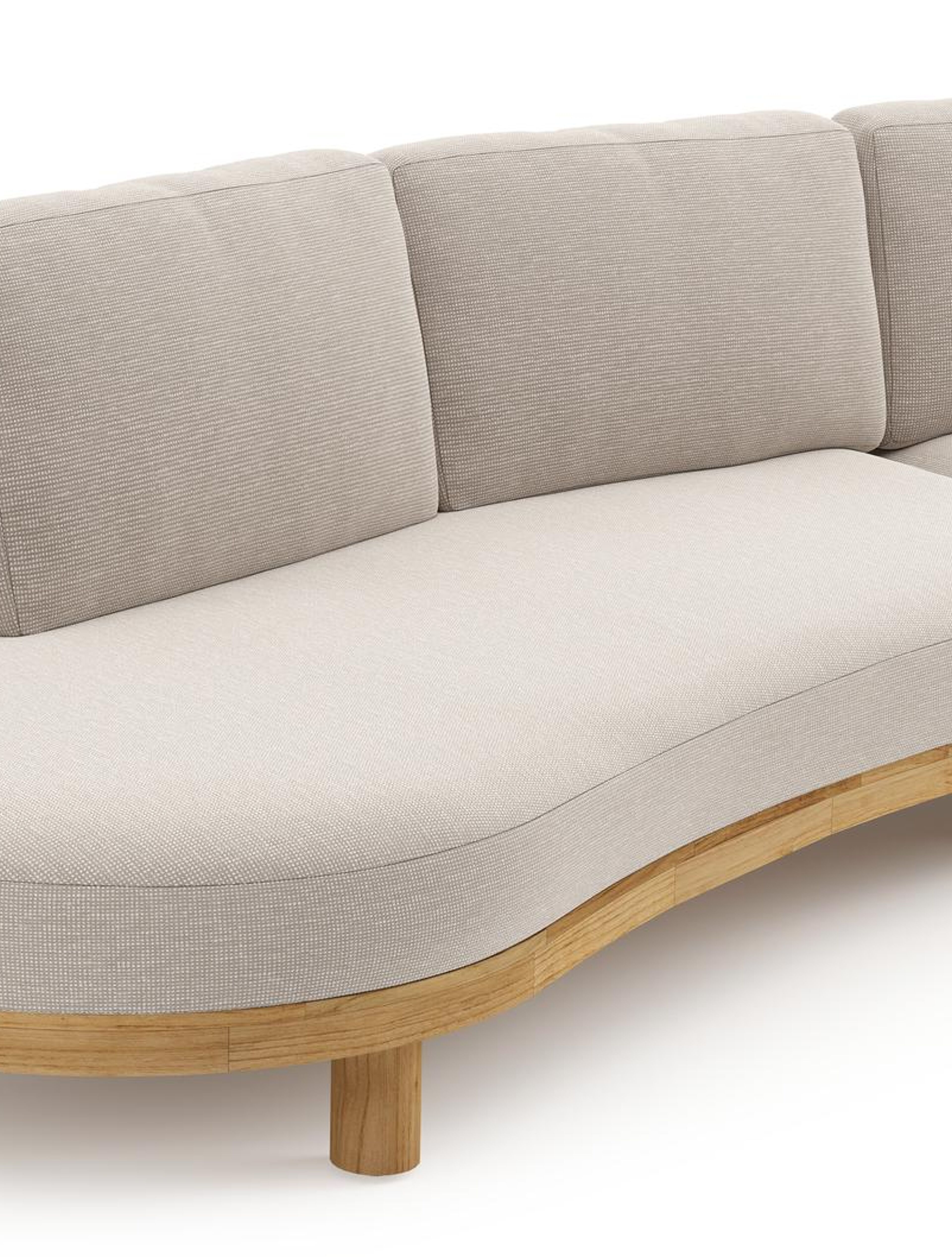 Donato loungehoek in teak en beige verticaal geweven ronde rope met all weather sunbrella® luxe Slow Farafra kussen | Exterioo tuinmeubelen