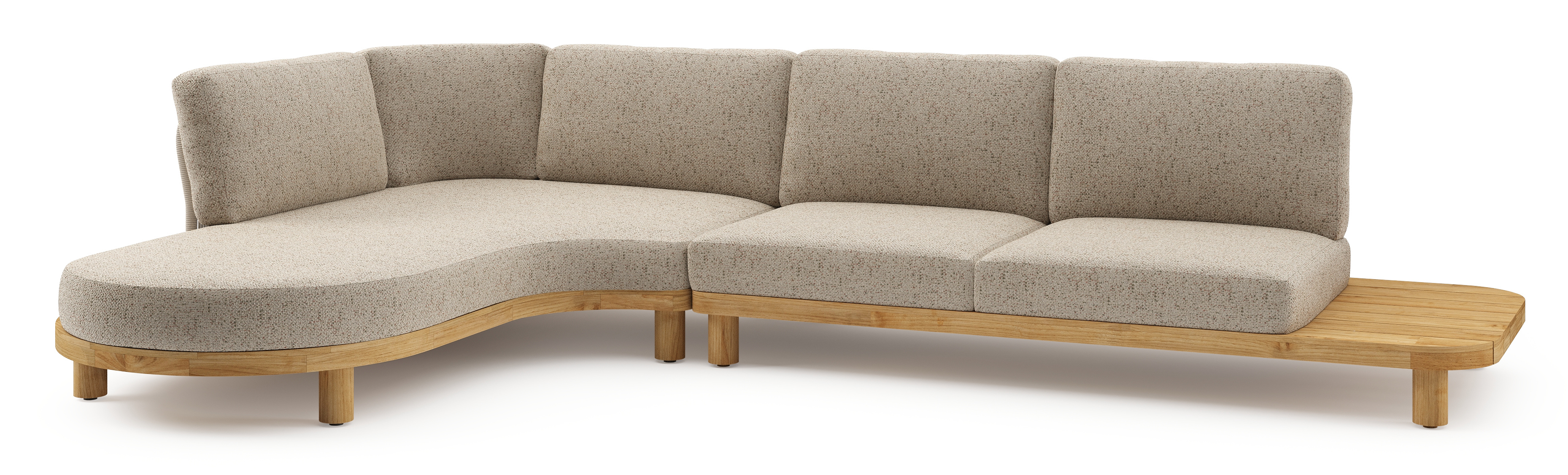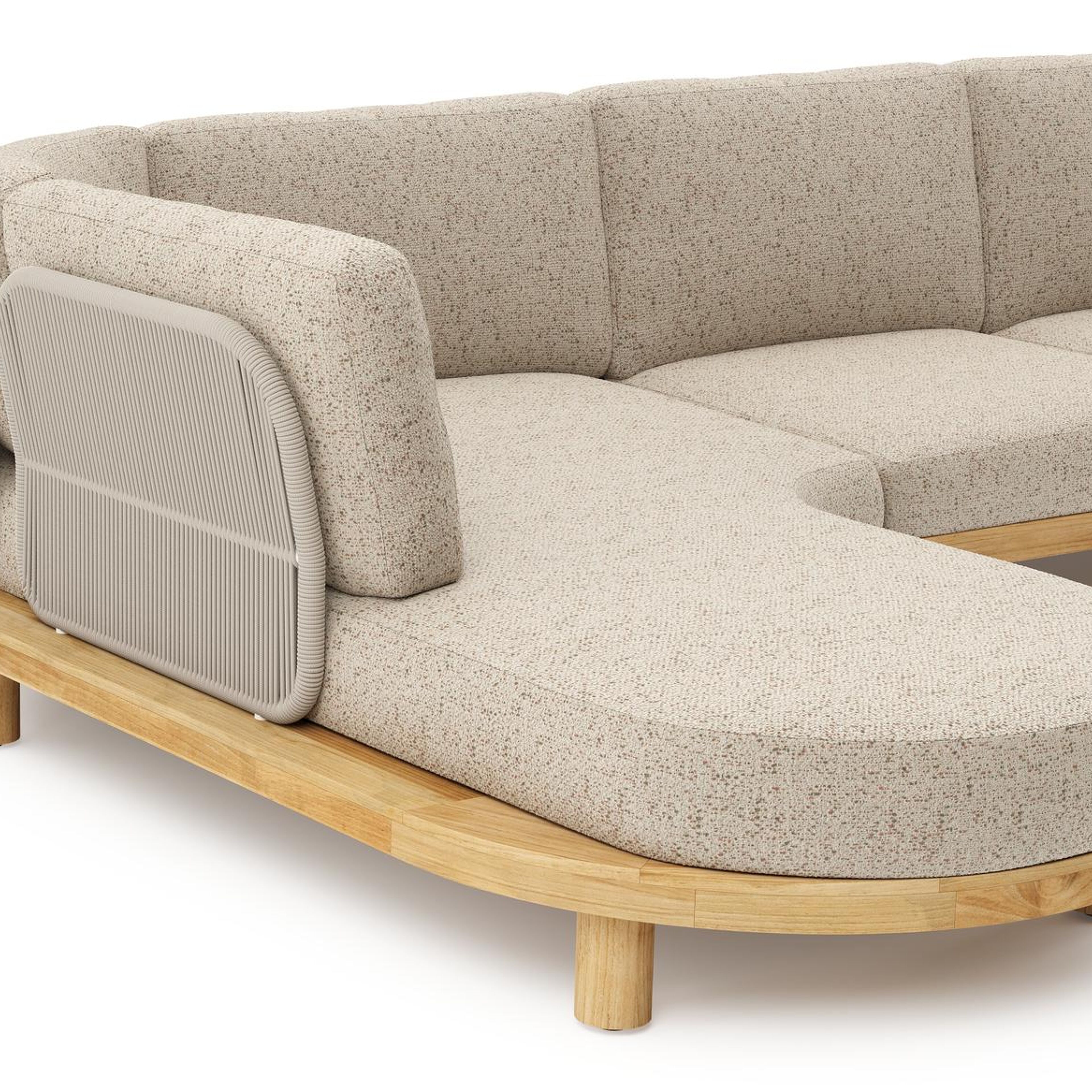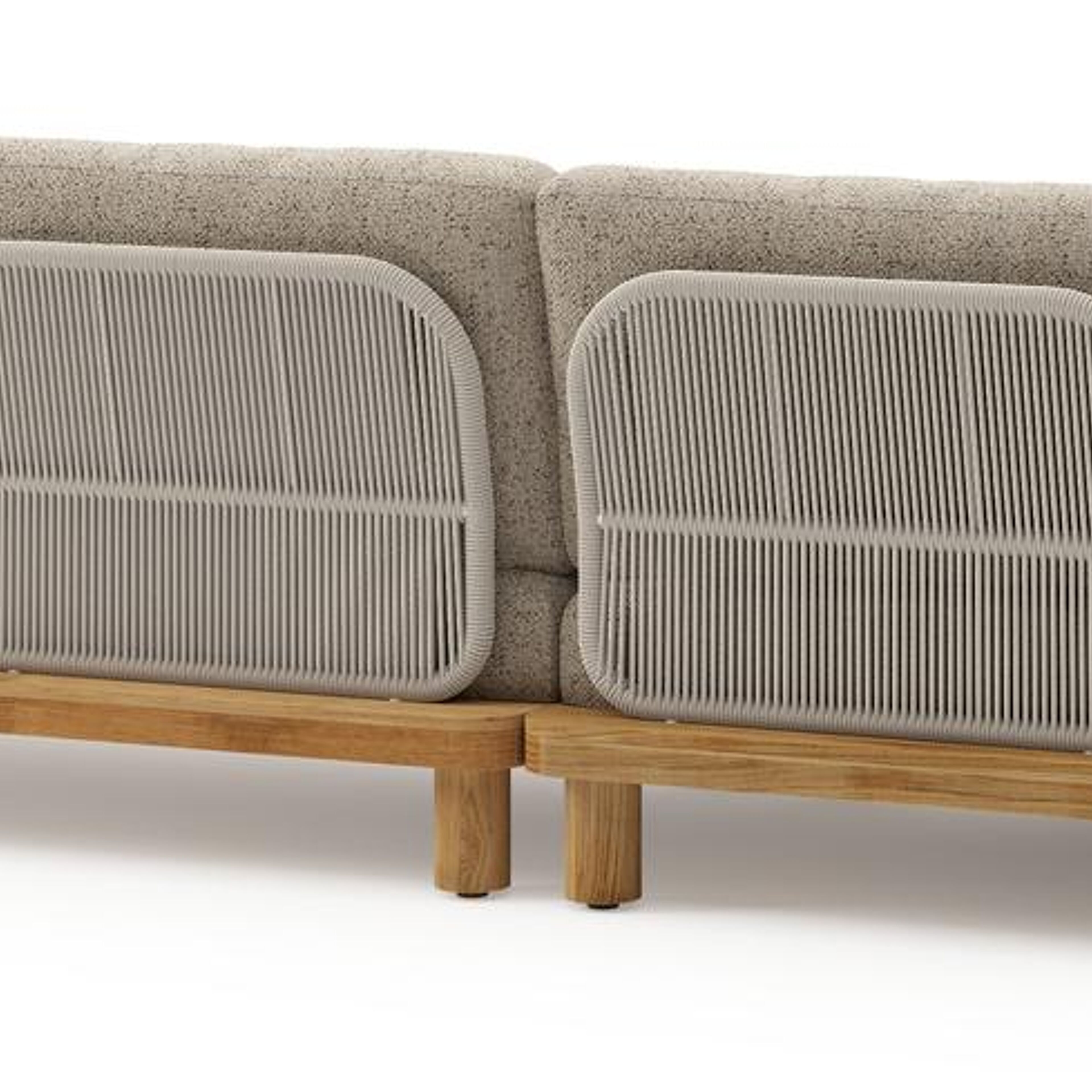 Donato loungehoek in teak en beige verticaal geweven ronde rope met all weather cosytica Bora Jungle kussen | Exterioo tuinmeubelen