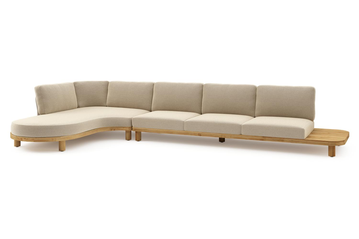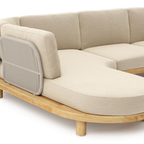 Donato loungehoek in teak en beige verticaal geweven ronde rope met all weather cosytica Althea Camel kussen | Exterioo