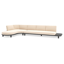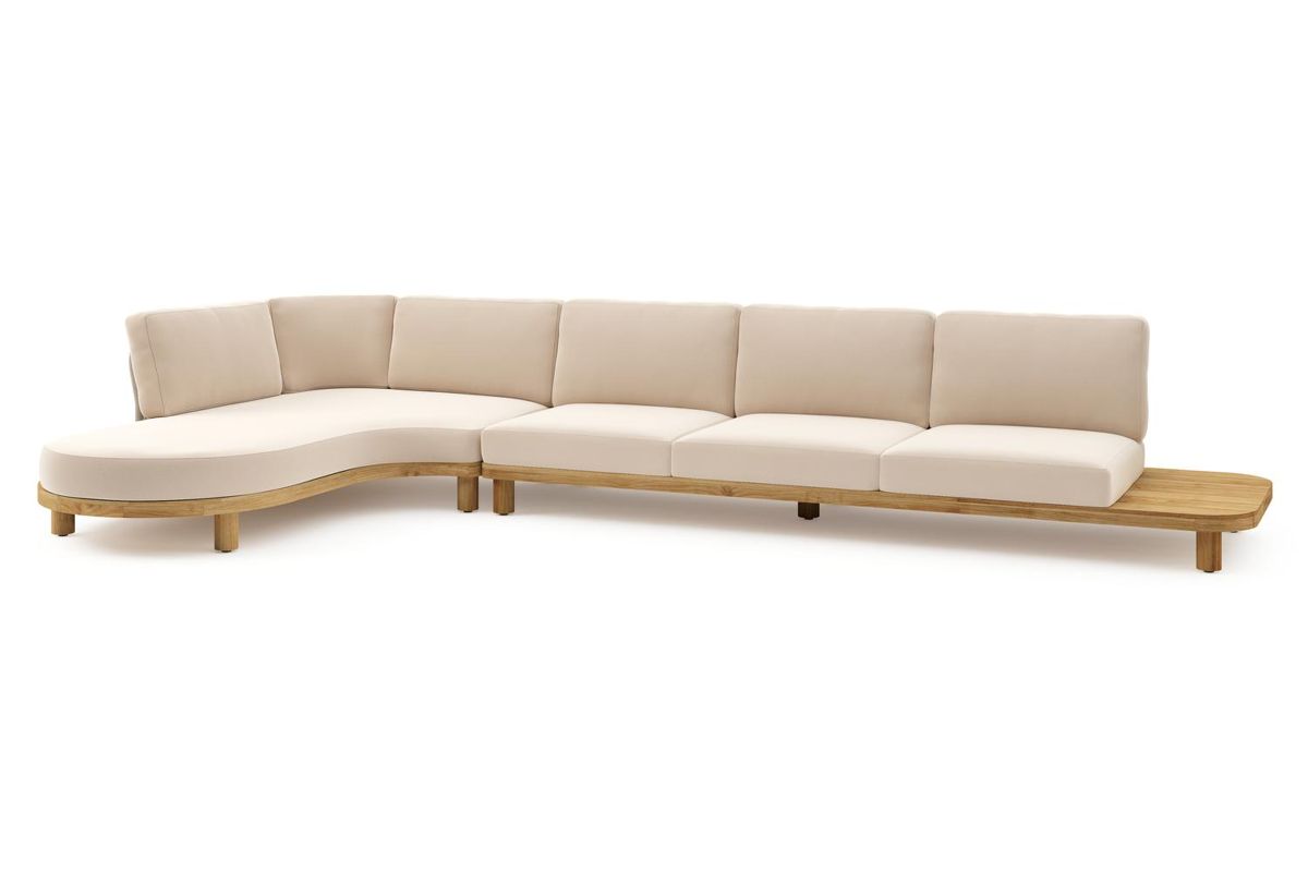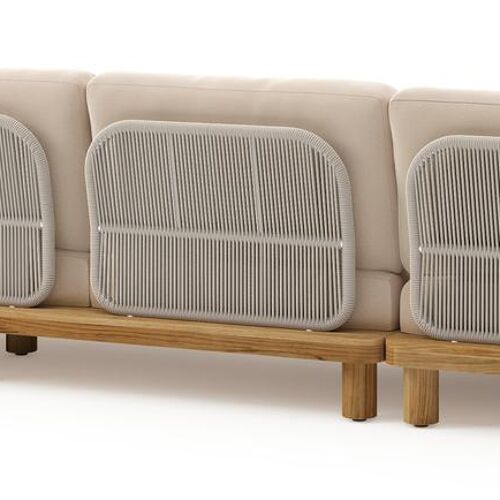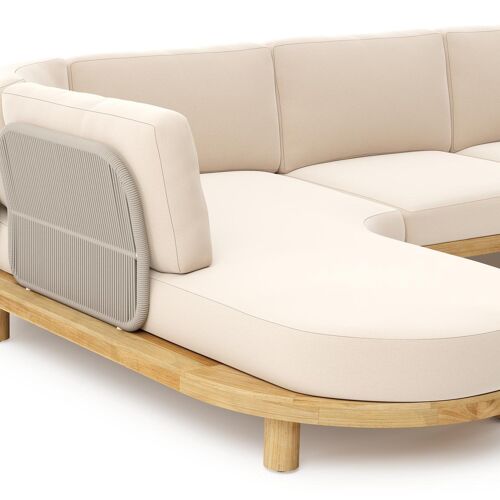 Donato loungehoek in teak en beige verticaal geweven ronde rope met all weather sunbrella® luxe Natte Linen Chalk kussen | Exterioo