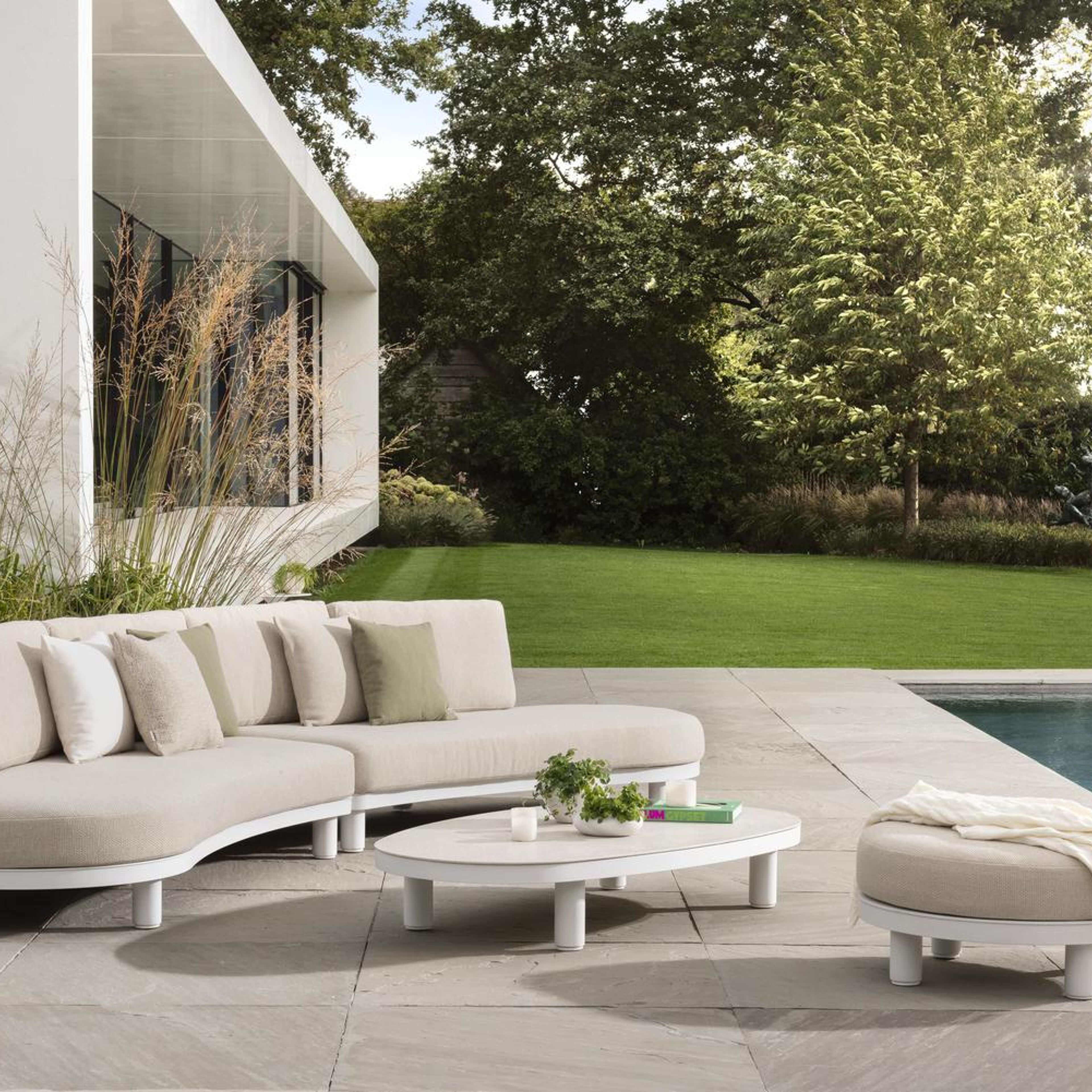 Donato omarmt de natuur met vloeiende vormen, warm teak en stijlvol aluminium in wit, zwart of beige. Een ontwerp dat rust uitstraalt, karakter toevoegt en natuurlijke elegantie naar je tuin brengt.