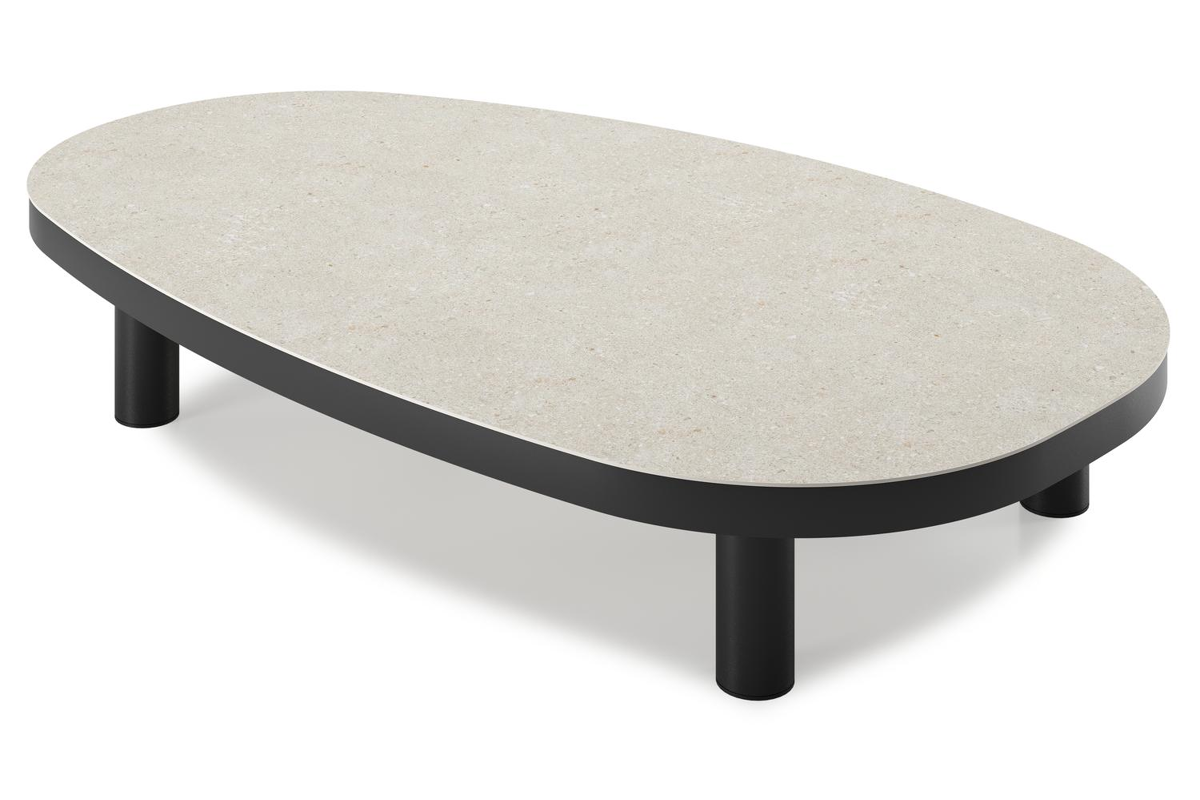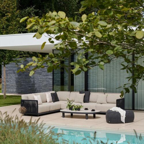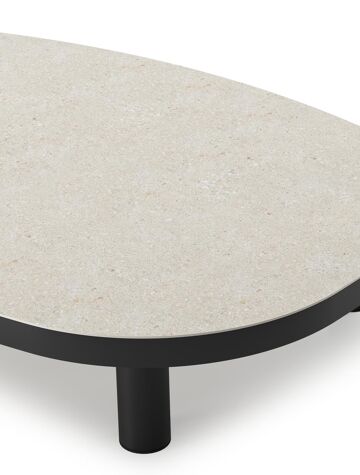 De Donato loungetafel is een trendy exemplaar dankzij zijn organische vorm. Het frame is strak aluminium. De aardse kleurschakeringen van het tafelblad in Shilin passen perfect bij de nieuwste outdoortrends. In het tafelblad is er een licht reliëf en fijne glinster die het Shilin blad de look & feel geven van echte natuursteen.