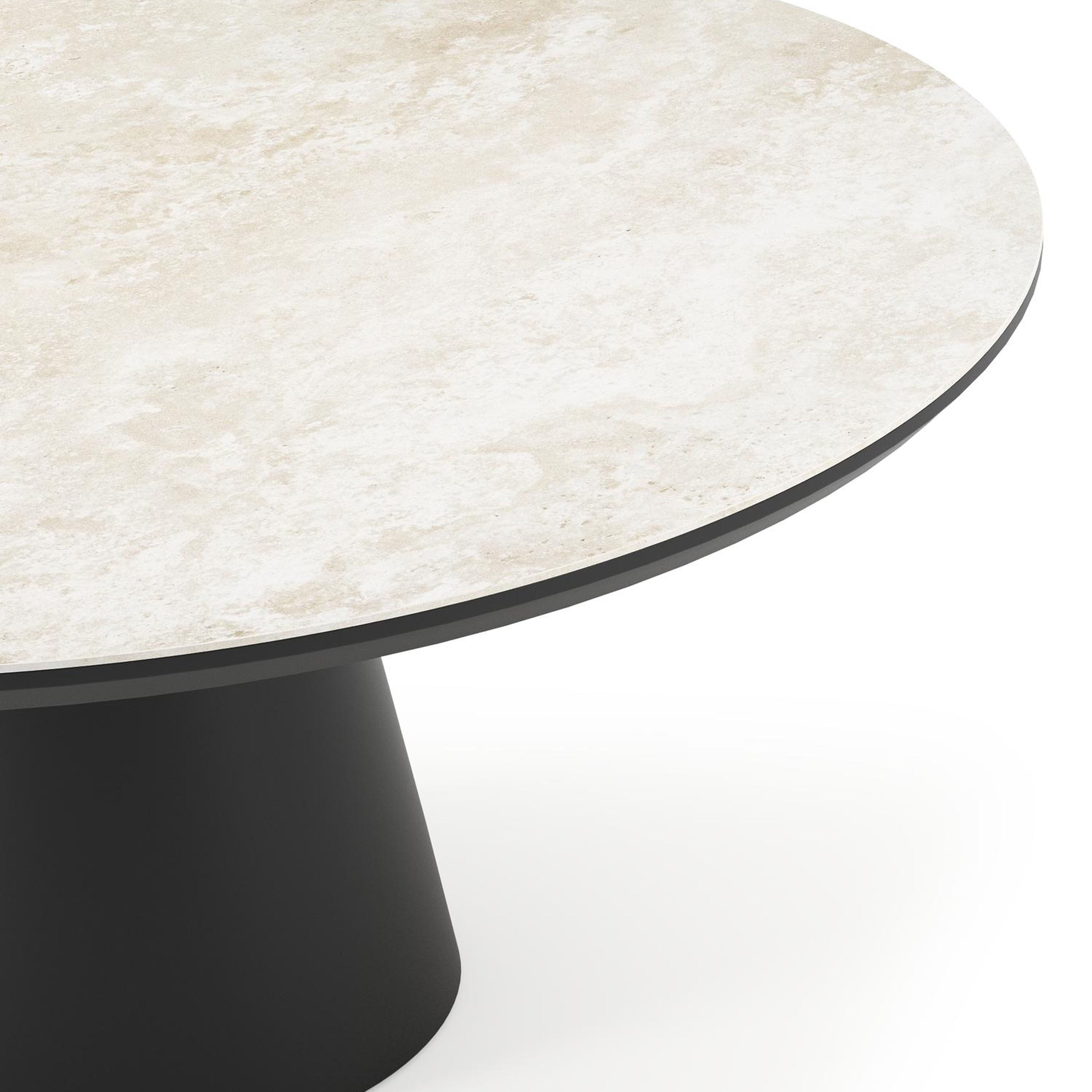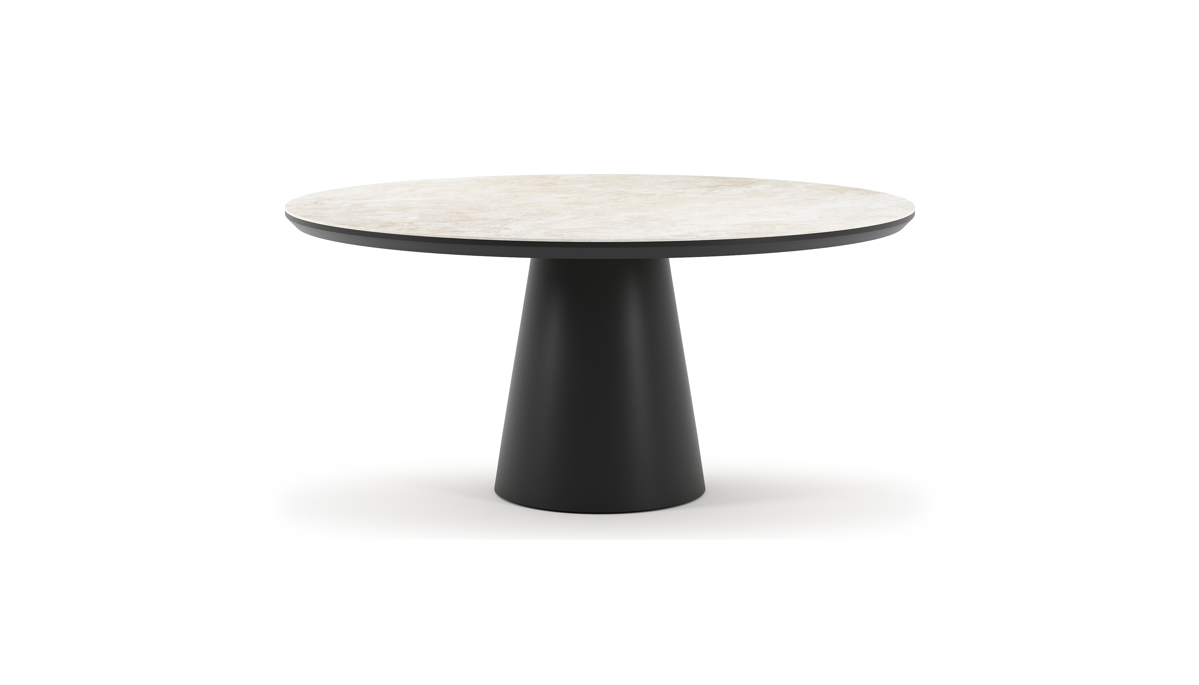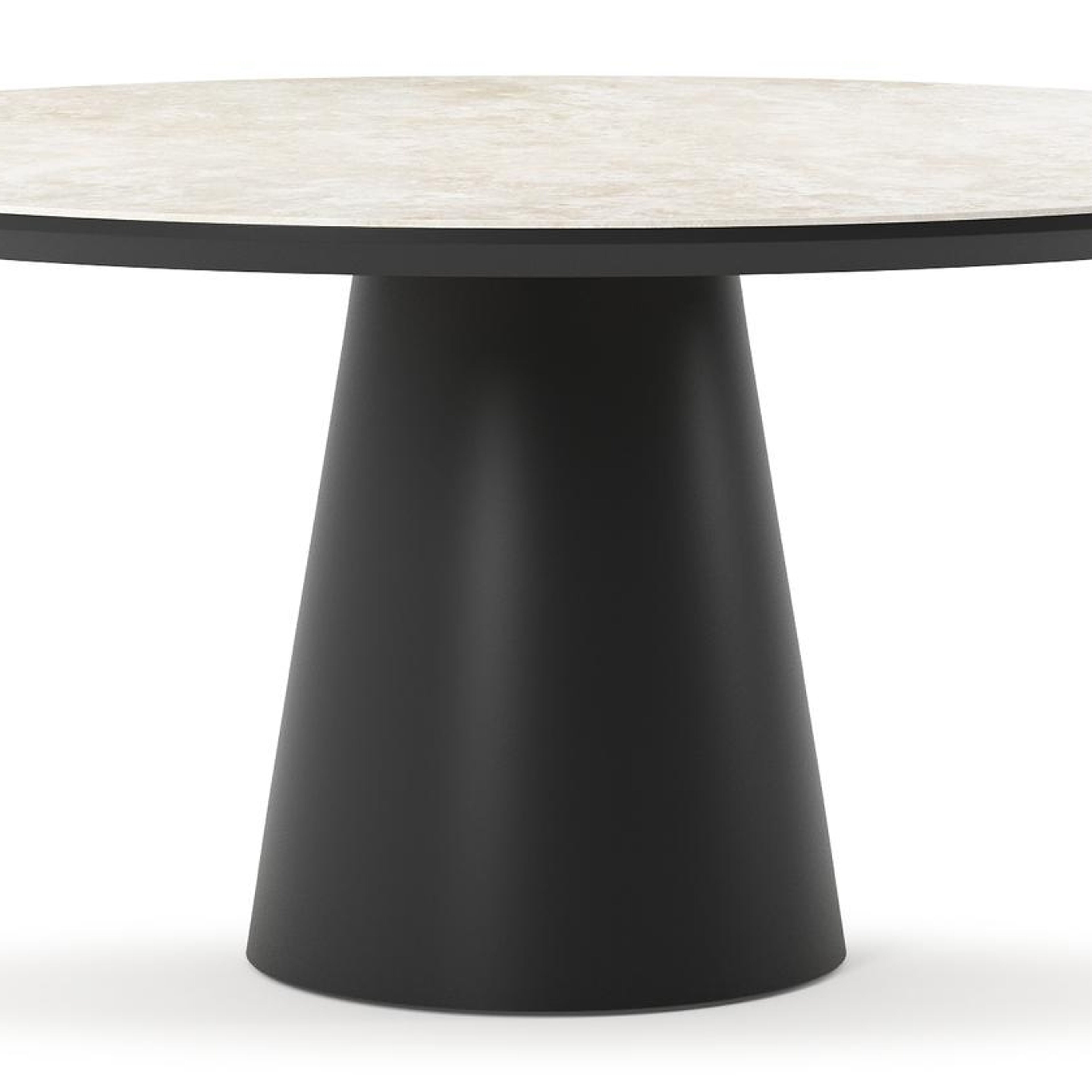 De Donato tuintafel omarmt elegantie in de buitenlucht met robuuste speelse vormen. Met een conische poot volledig gemaakt uit aluminium en een afgerond tafelblad, creëert deze tafel een harmonieuze samensmelting van een hedendaags design en een robuuste look.