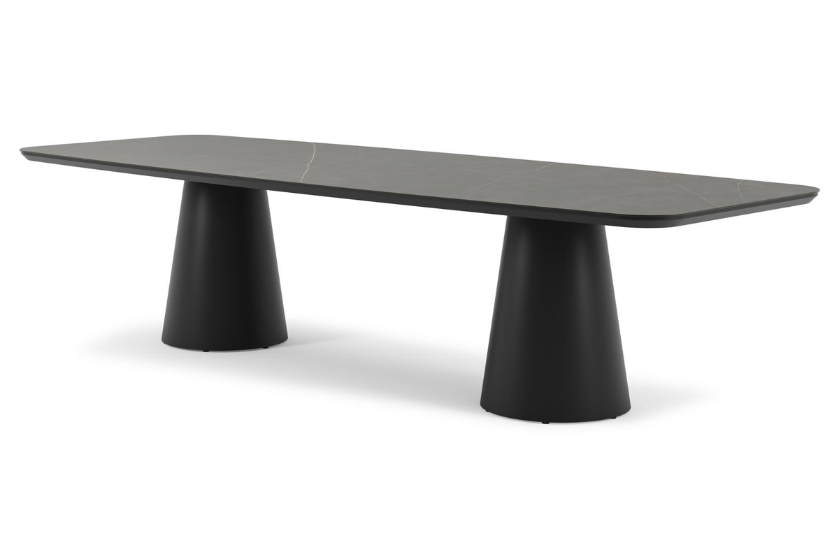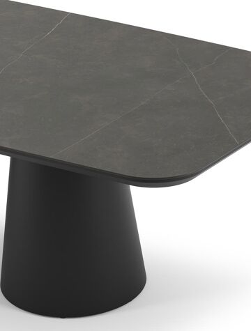 De Donato tuintafel omarmt elegantie in de buitenlucht met robuuste speelse vormen. Met een conische poot volledig gemaakt uit aluminium en een afgerond tafelblad, creëert deze tafel een harmonieuze samensmelting van een hedendaags design en een robuuste look.
